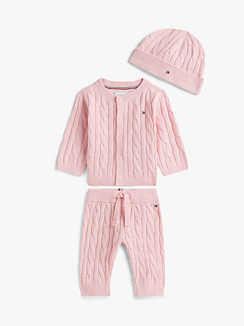Kablo örgülü bir hırka, jogger pantolon ve uyumlu bir bere içeren bu hediye kutusu, miniklere hem sıcaklık hem sevimli bir görünüm kazandırır.