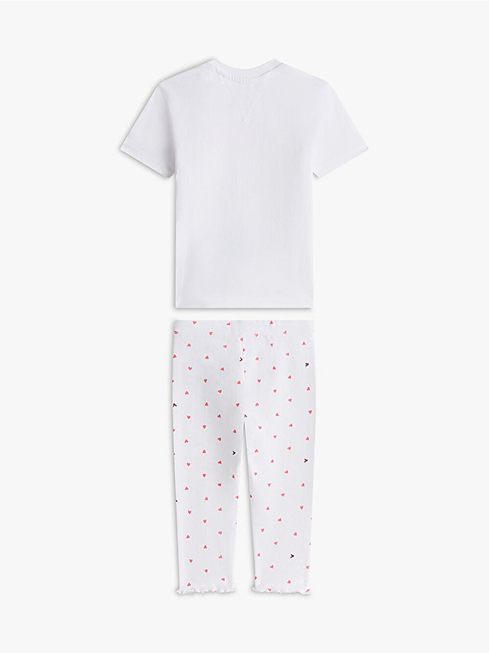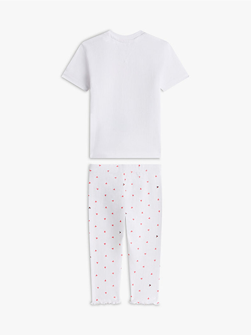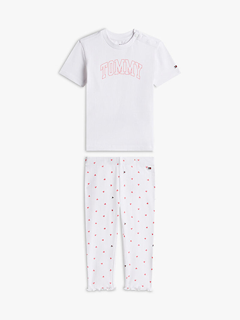 Neşeli bir logoya sahip bisiklet yaka tişört ve uyumlu ajurlu tayttan oluşan bu sevimli takımla sevgi dolu bir stil yakalayın.