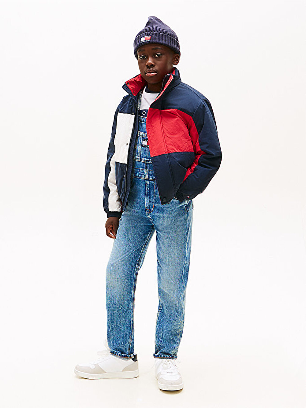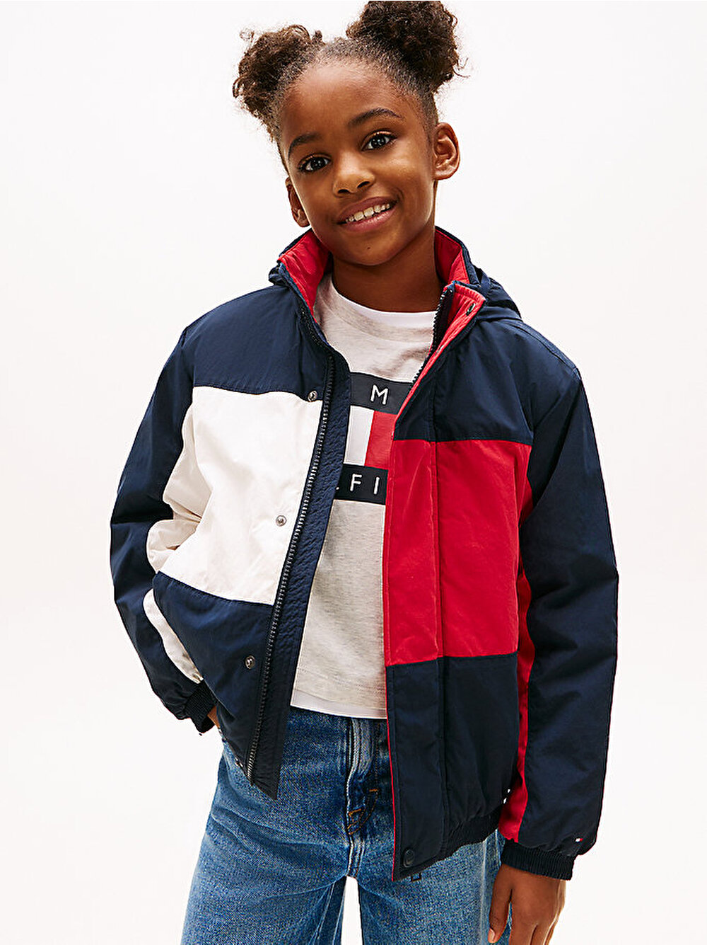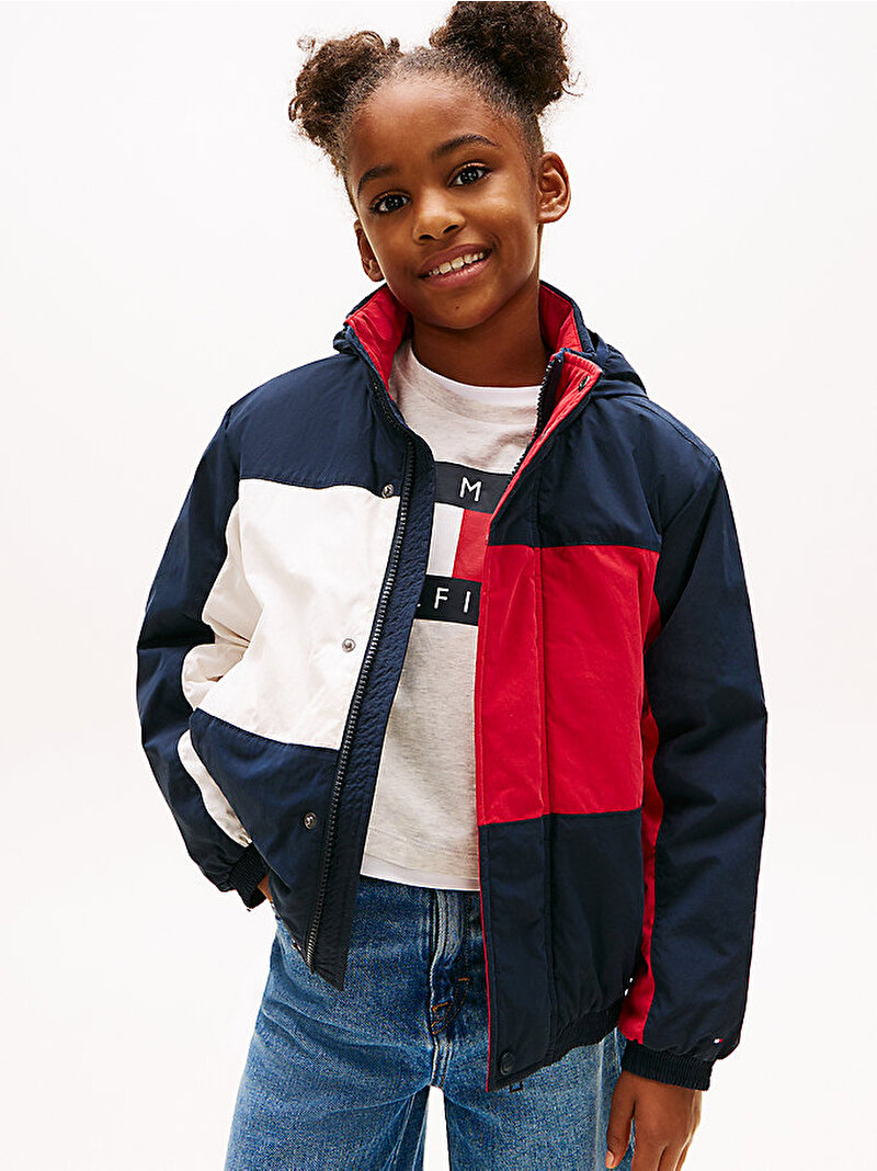 Tamamı renk bloklu bayrak deseniyle öne çıkan, toplanabilir kapüşonlu bu relaxed fit ceketle hem şık hem güvenli bir tarz yakalayın.