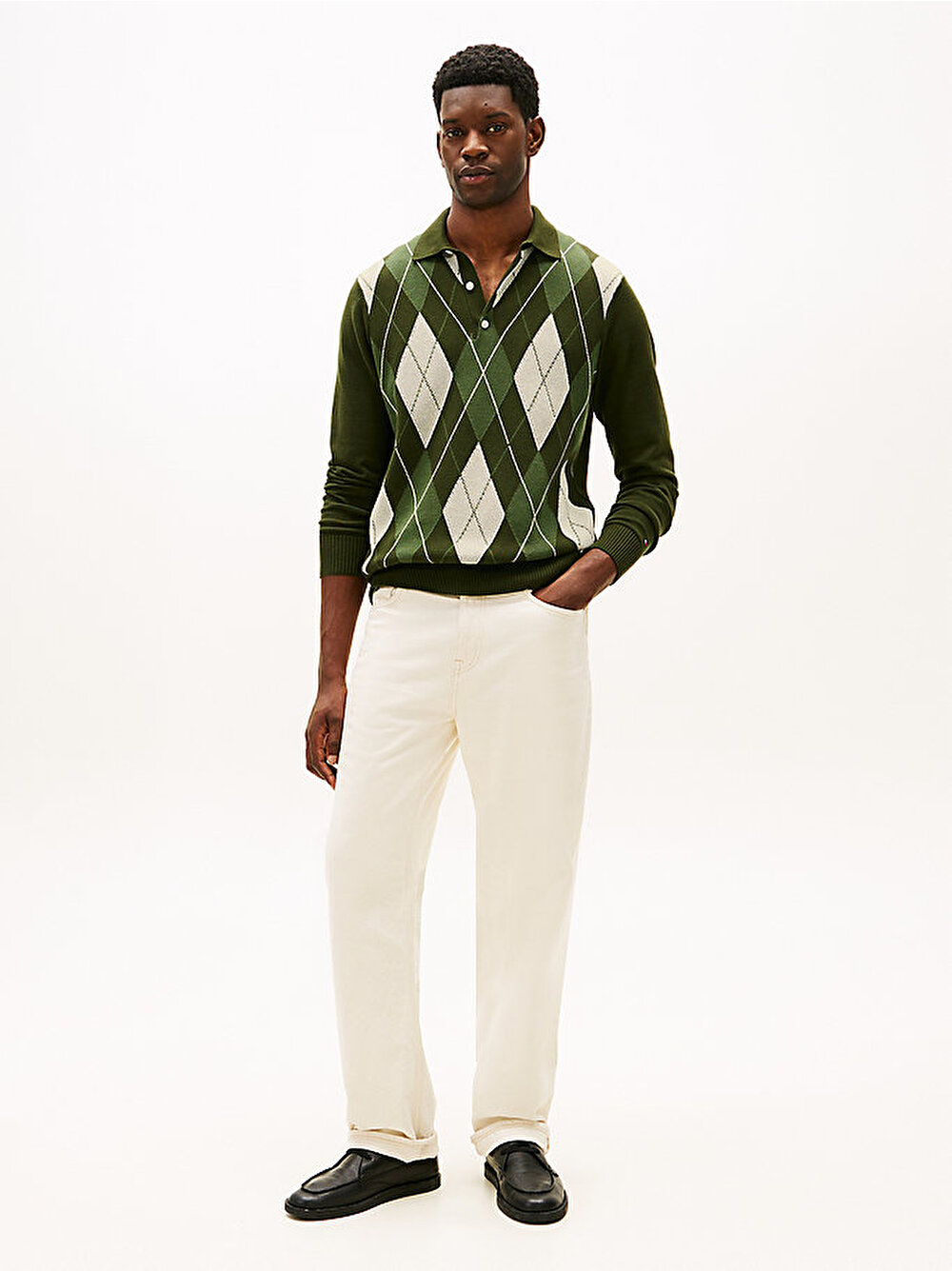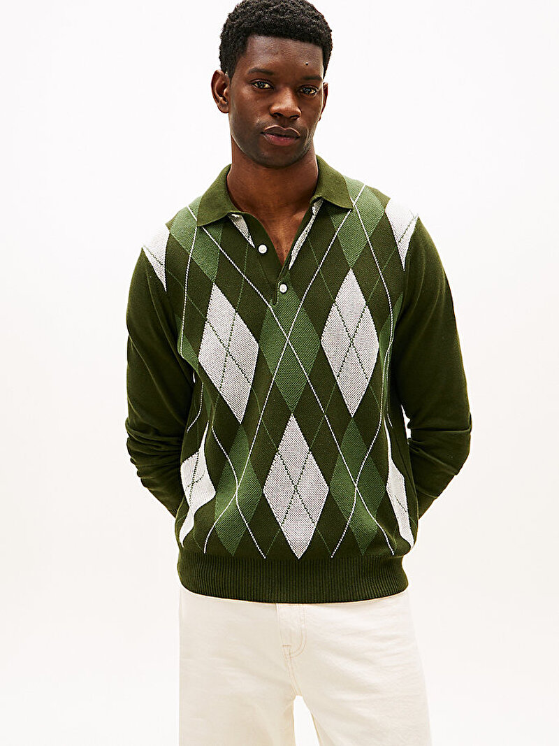 Önde ve omuzlarda klasik baklava deseni taşıyan bu rugby yaka kazakla günlük stillere iddialı bir tasarım getirin.
