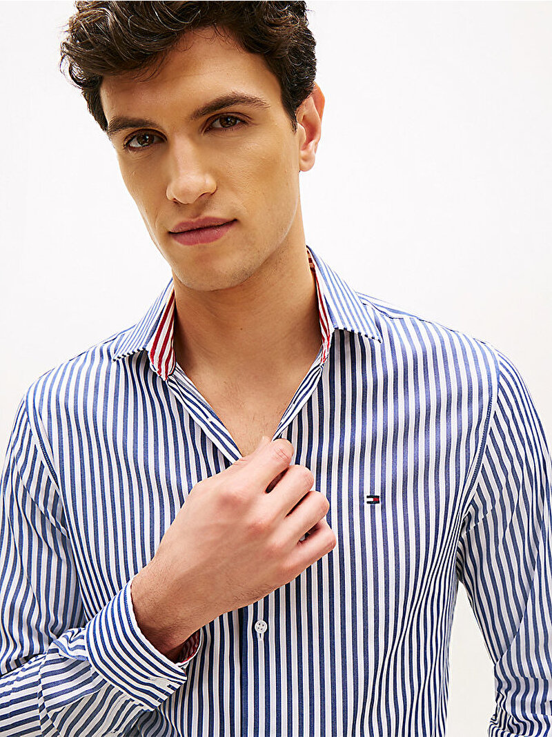 Canlı ve boydan boya Bengal çizgili tasarımıyla tamamlanan bu slim fit streç pamuklu poplin gömlek ile kıyafetlerinize enerji katın.