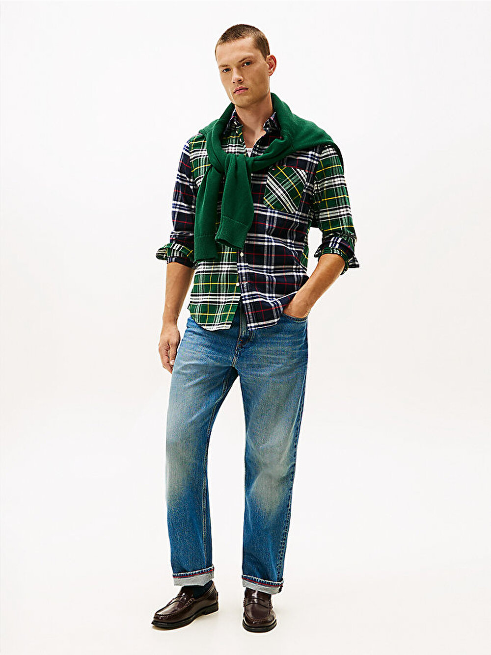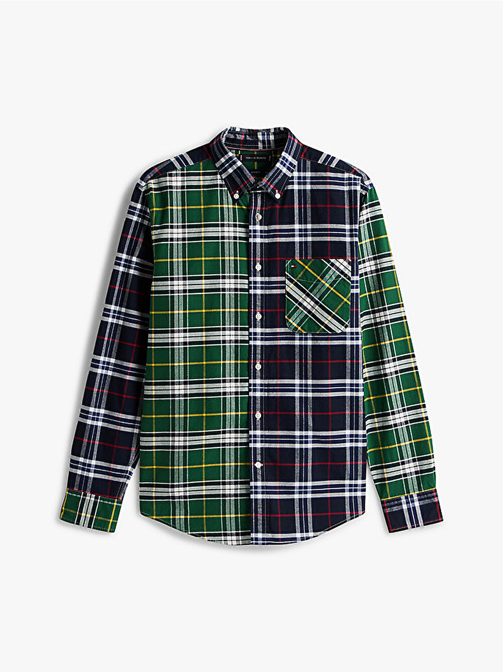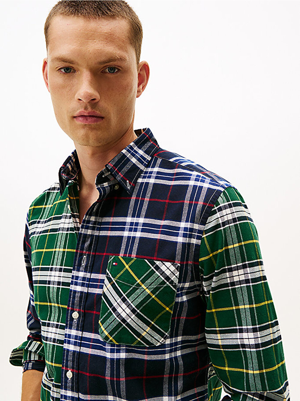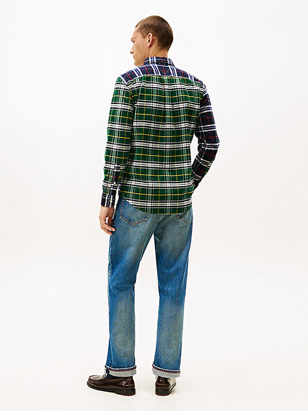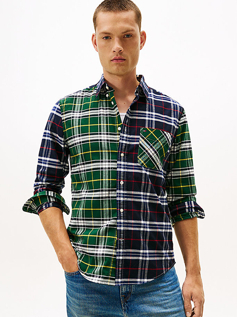 Kontrast oluşturan çok renkli ekose desenler, düğmeli yaka ve yama cebi bulunan bu klasik Oxford pamuklu gömleğe iddialı bir stil kazandırıyor.