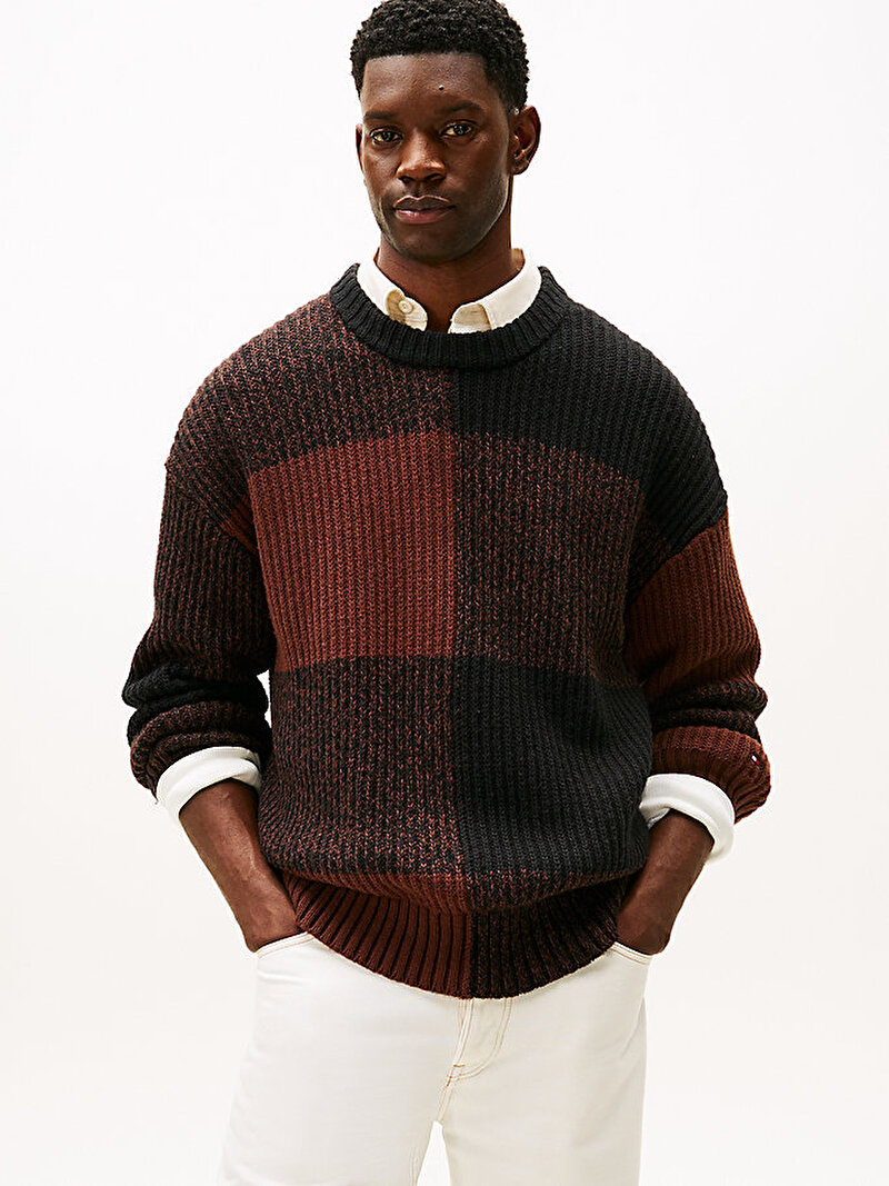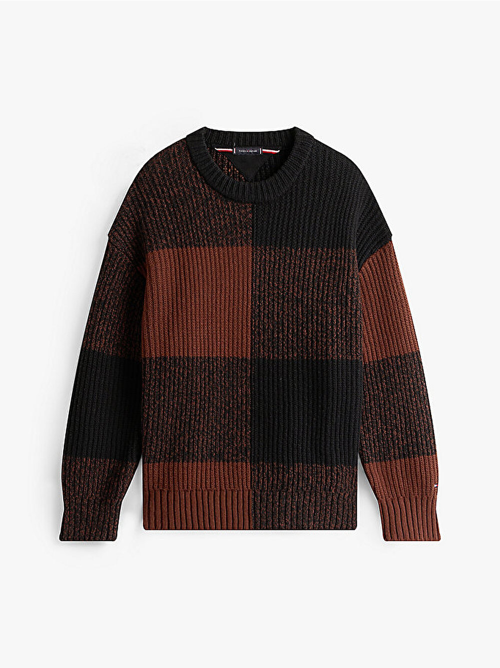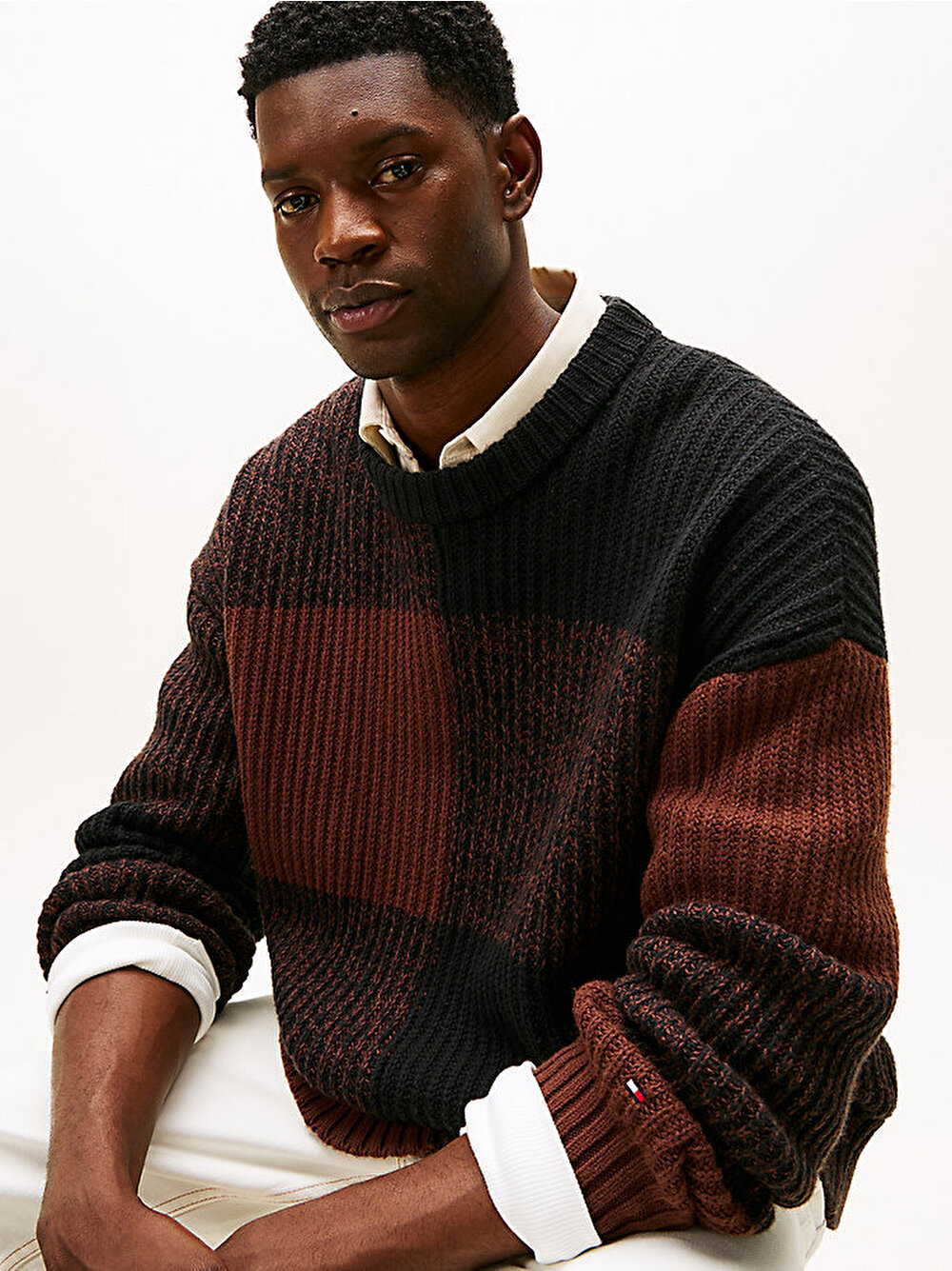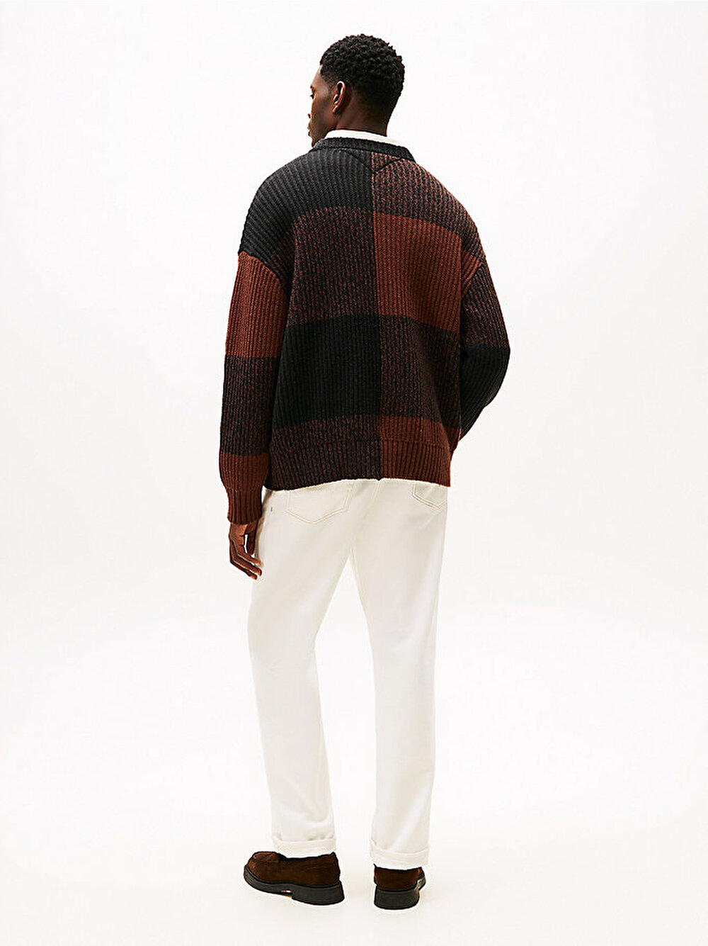 Pamuk ve yün karışımından üretilen bu kazak, zamansız bufalo ekose deseni ve klasik bisiklet yaka kesimiyle dikkat çeker.