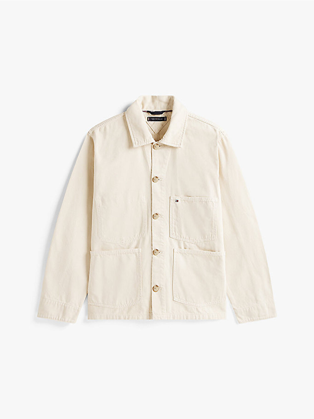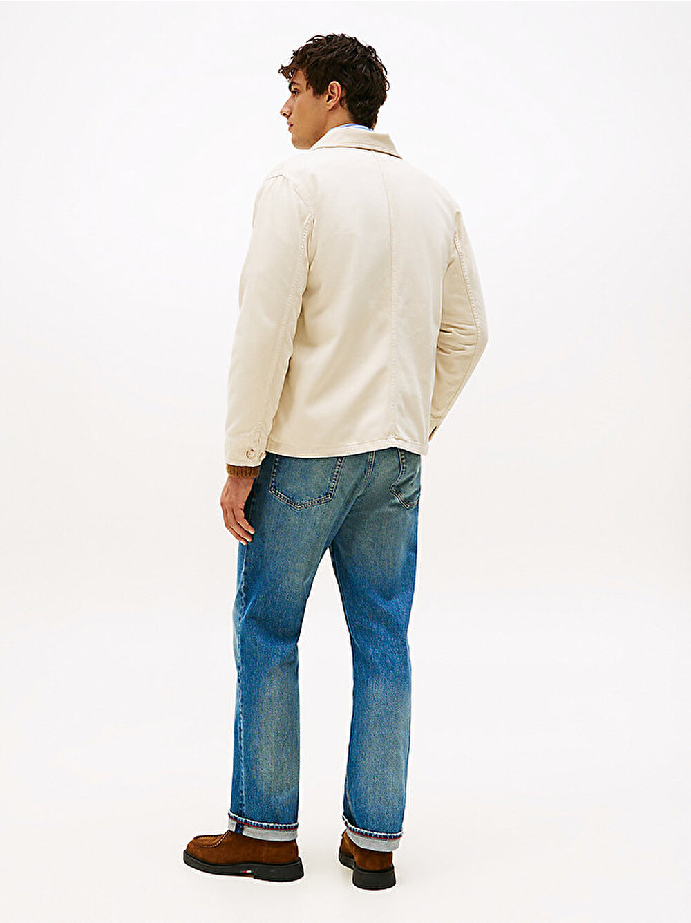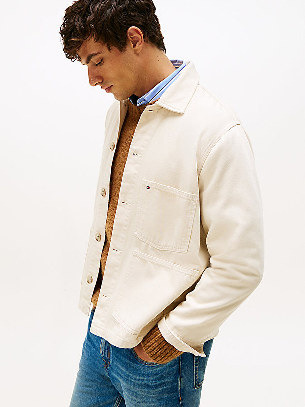 Bu chore ceket, sert pamuklu denimden üretilmiştir ve yaşanmış bir görünüm için giysi boyalıdır, bu da onu şık bir katman haline getirir.