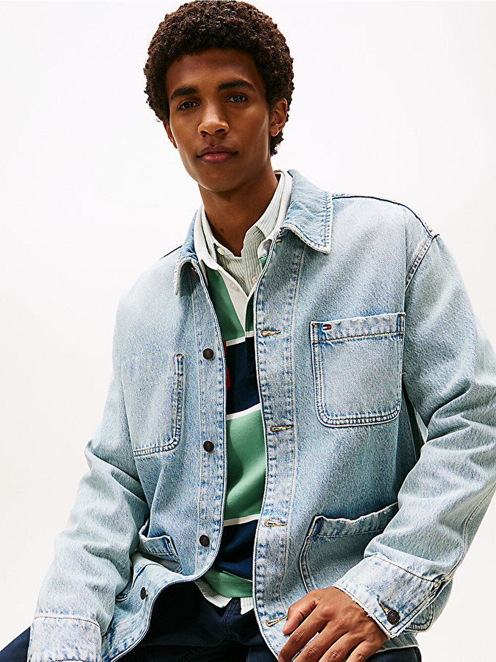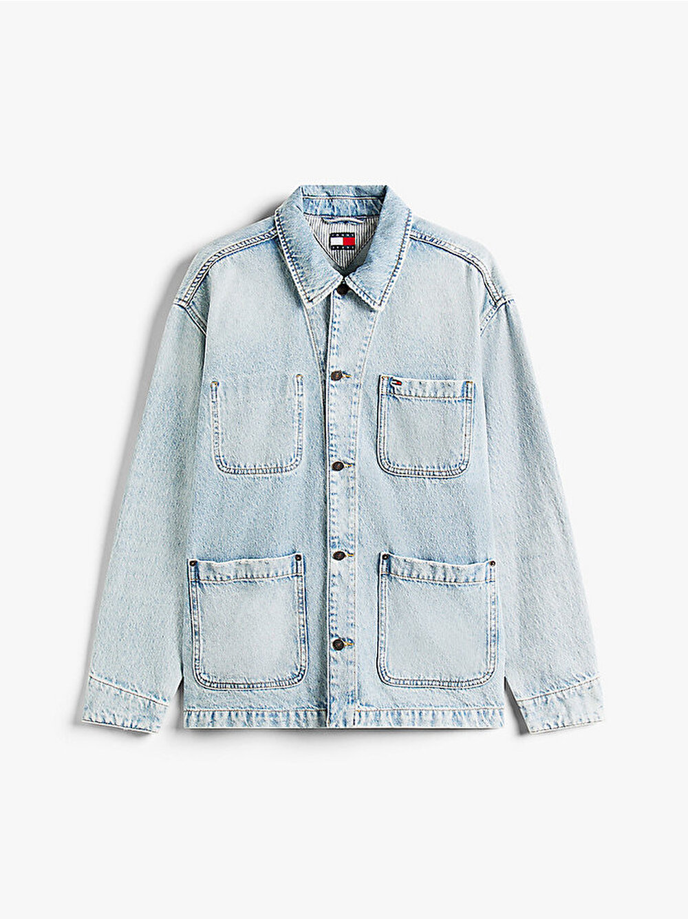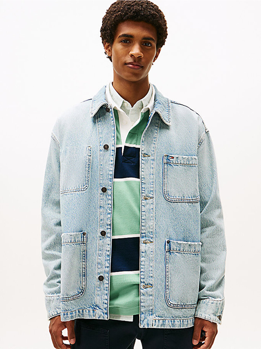 İşlevsel iş kıyafeti stillerinden esinlenen bu rahat kesim denim chore ceket, güneşte solmuş yüzeyiyle eskitilmiş bir görünüme sahiptir.
