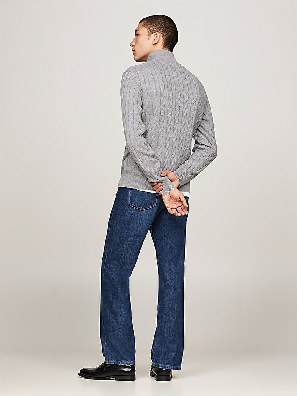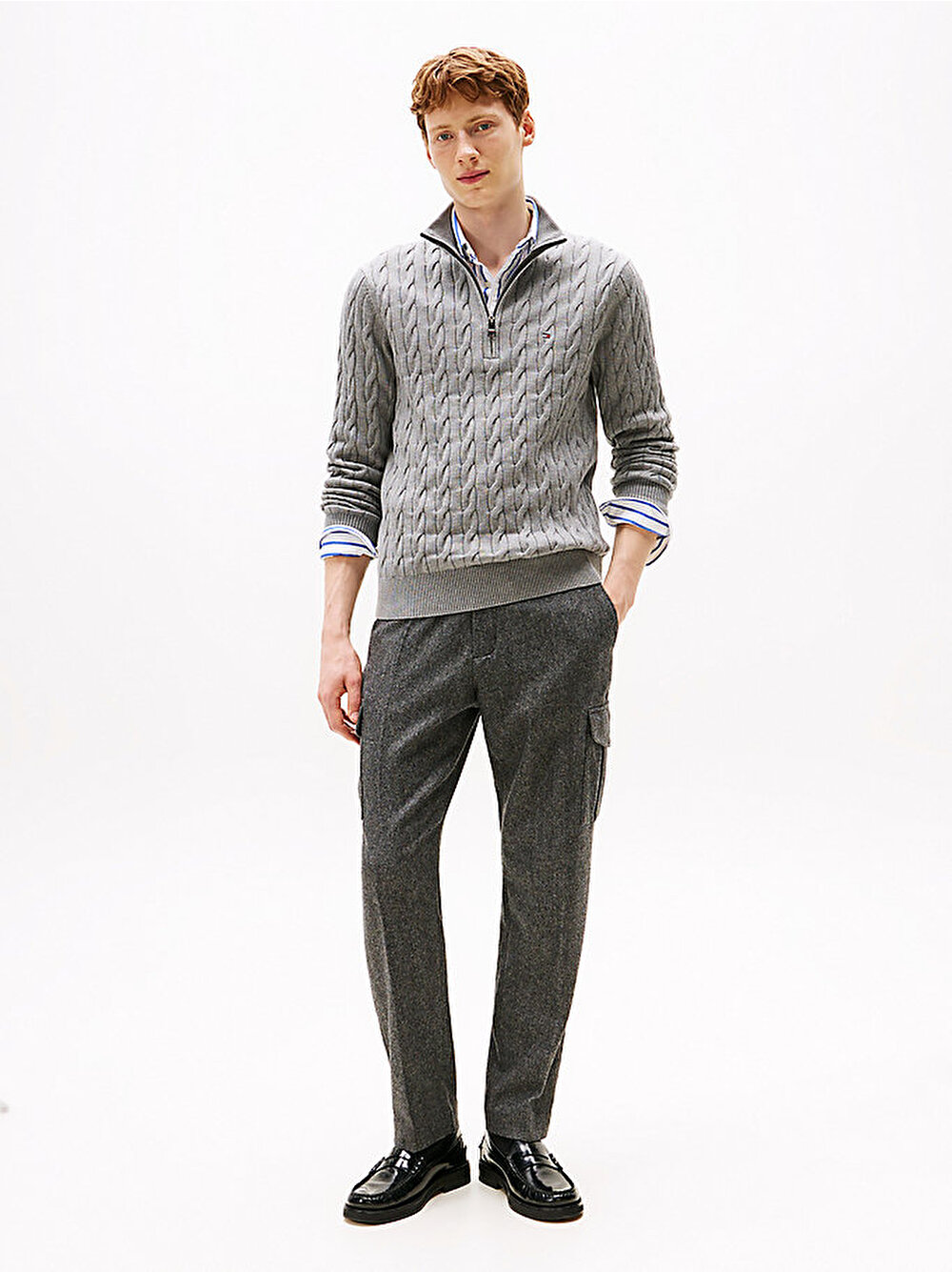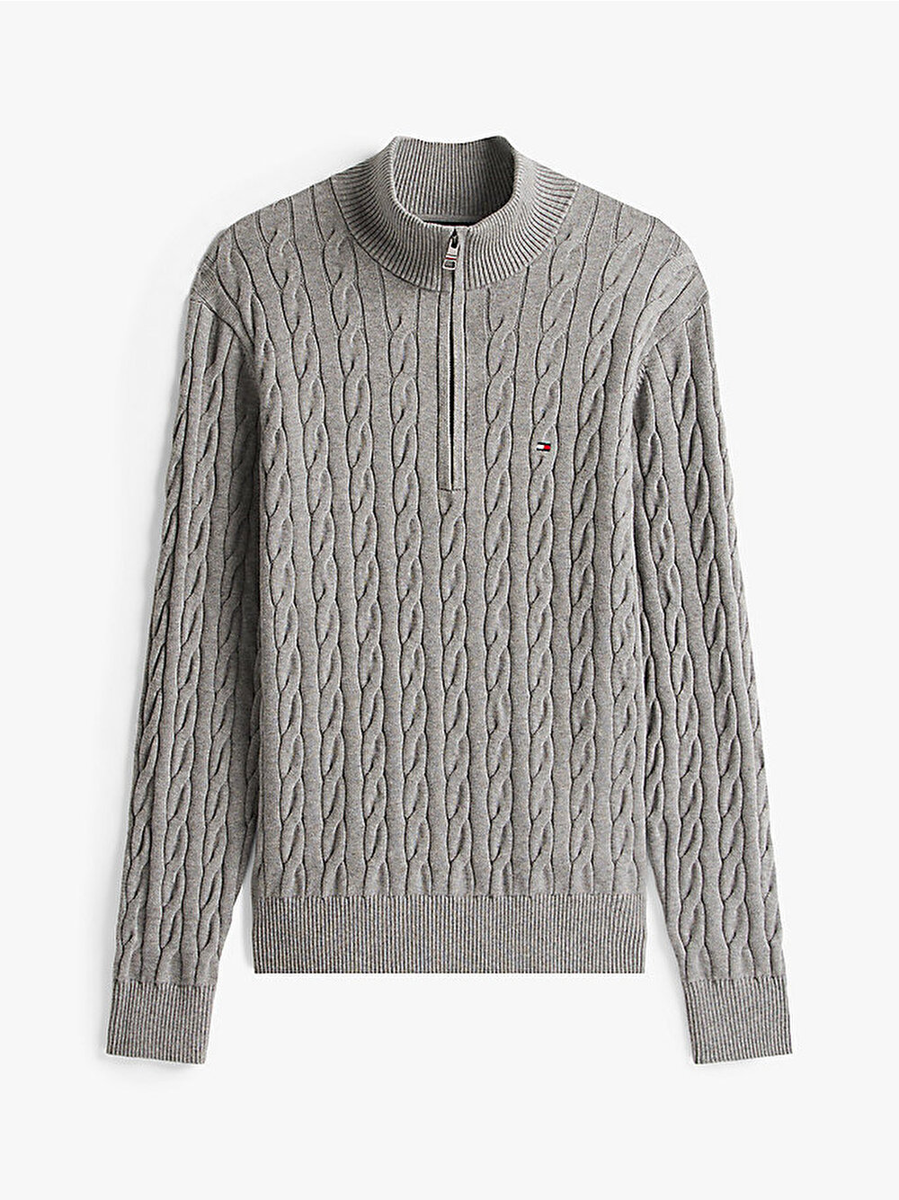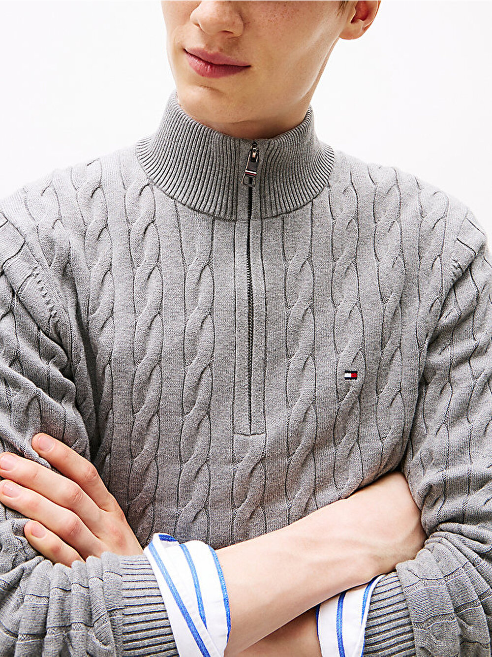 Bu penye kazak, sofistike bir siluet için klasik kablo örgüsünü yüksek yaka ve yarım fermuarla birleştiriyor.