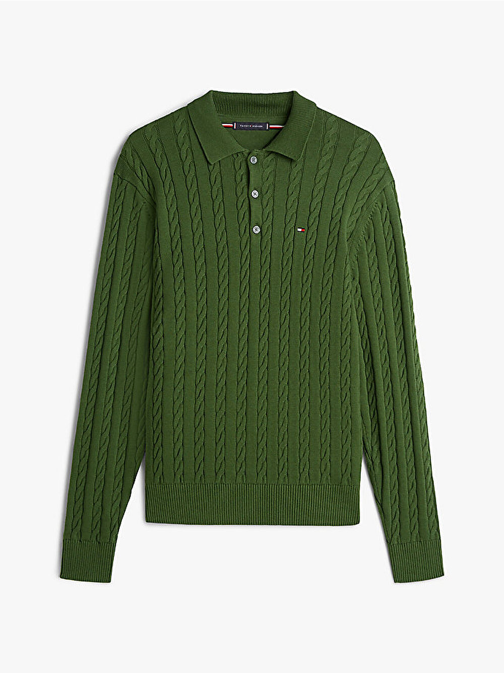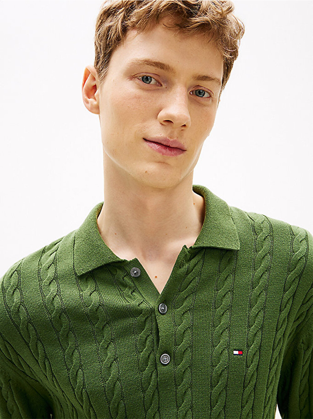 Polo yaka ile kablo örgü tasarımı bir araya getiren bu saf pamuklu penye kazak, preppy estetiğinden ilham alıyor.