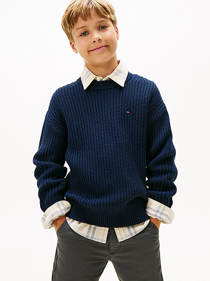 Kalın yarım hırka dikişi ile örülen bu rahat bisiklet yaka kazak, kendine has bir dokuya ve sıcak tutan bir yapıya sahiptir.