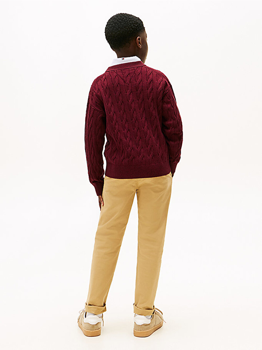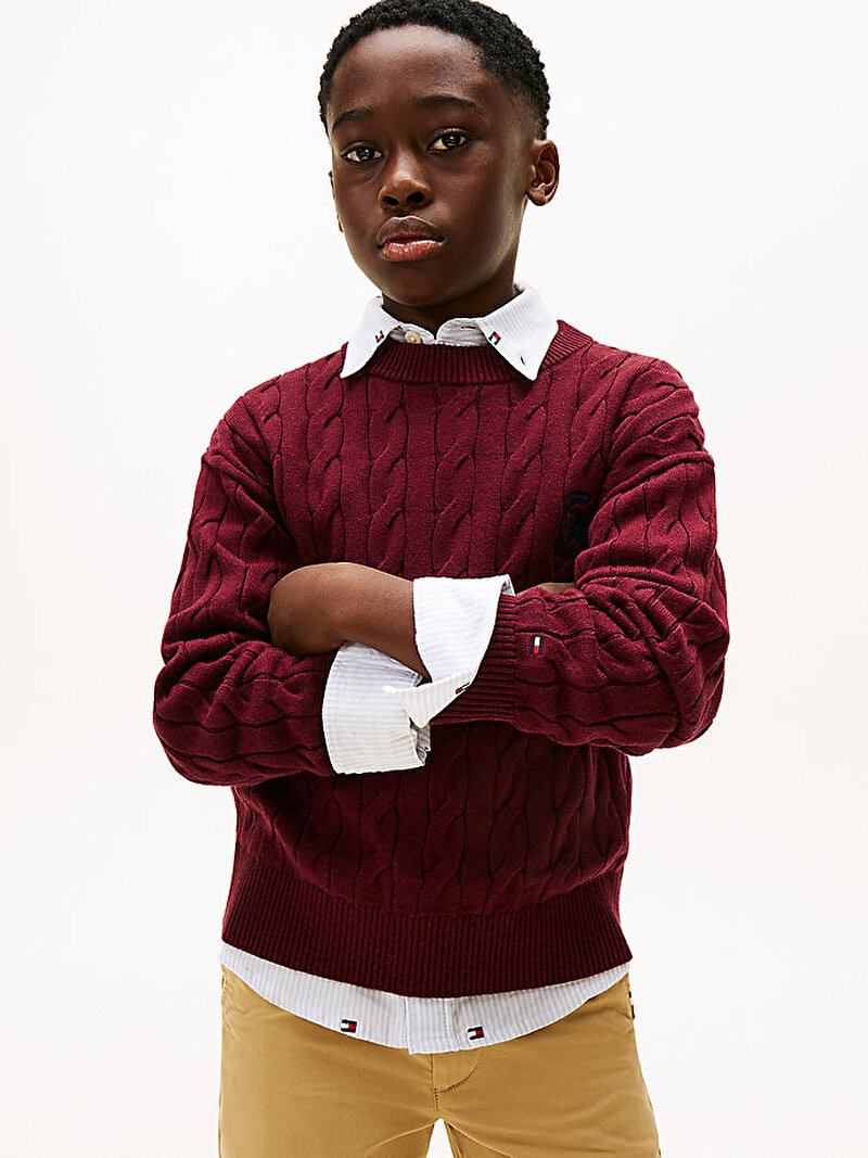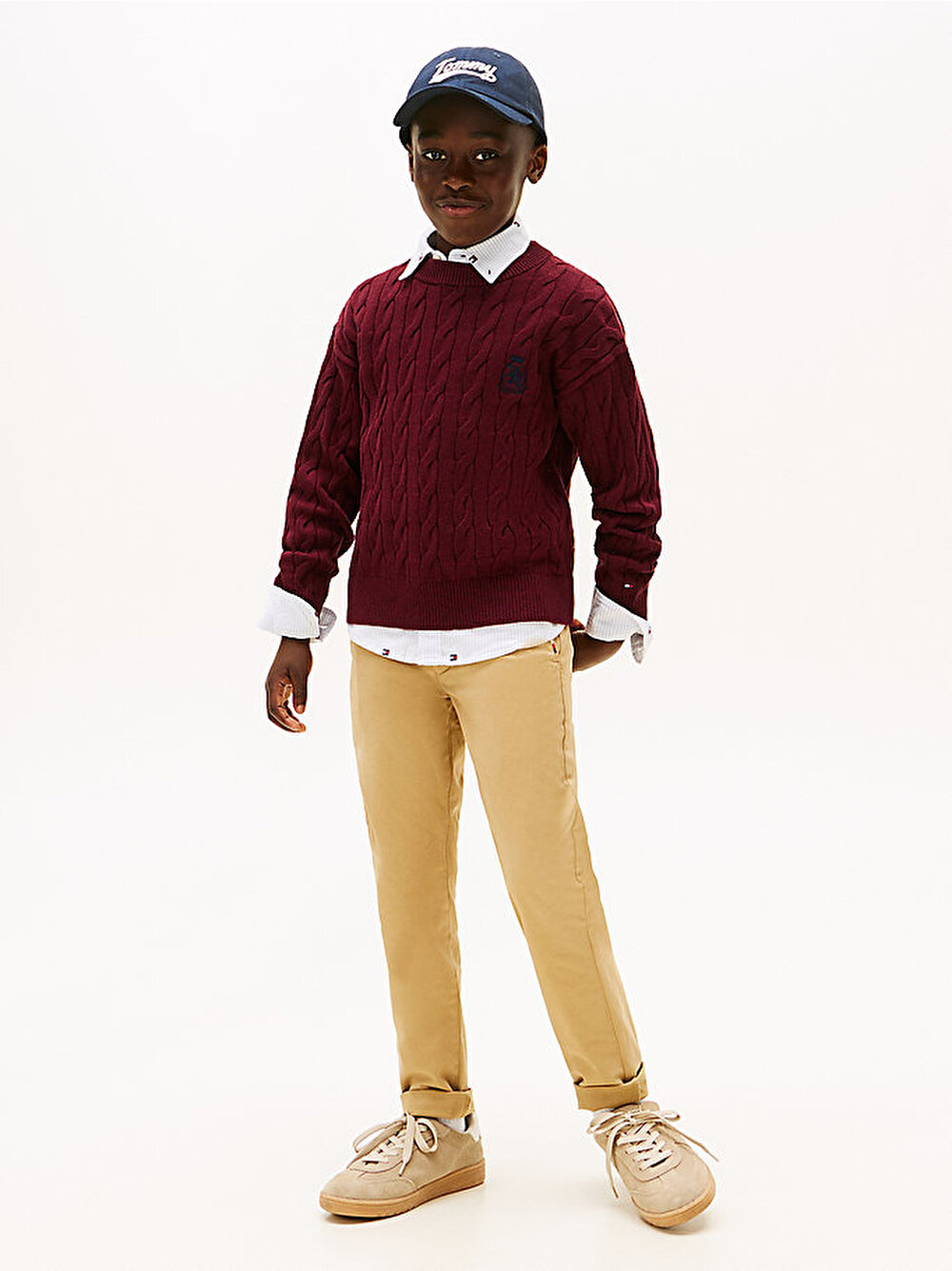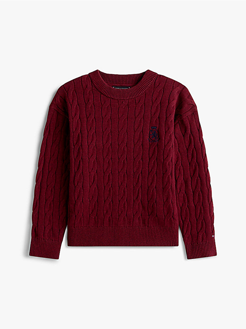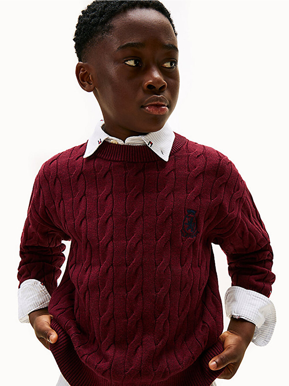 Geleneksel kablo örgü dokusu ve TH armalı nakışı, bu yumuşacık ve çok yönlü saf penye kazağa miras hissi katıyor.