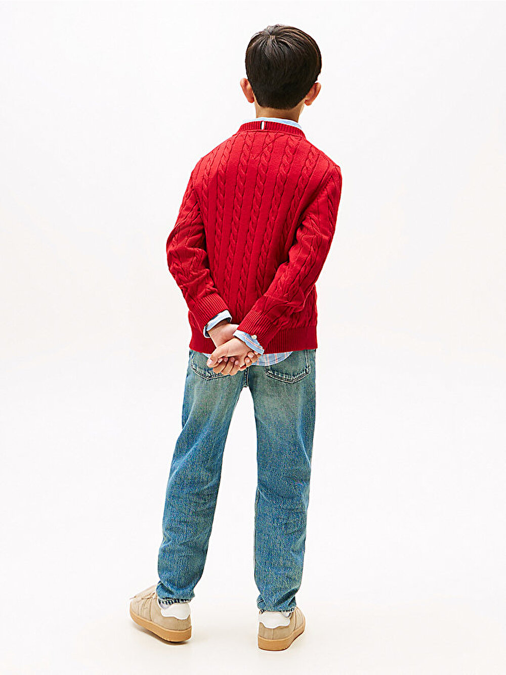 Klasik bisiklet yaka ve kablo örgü detayı sayesinde bu kazak hem rahat hem de daha resmi ortamlarda ya da okula yürürken bile şık bir tercih olabilir.
