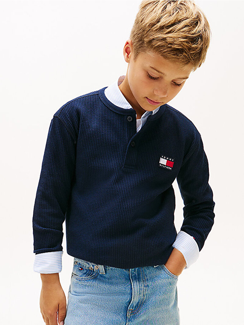 Uzun kollu, iki düğmeli Henley yaka ve dokulu waffle örgü kumaşıyla bu tişört, hafta sonu kombinlerinize klasik bir siluet katar.