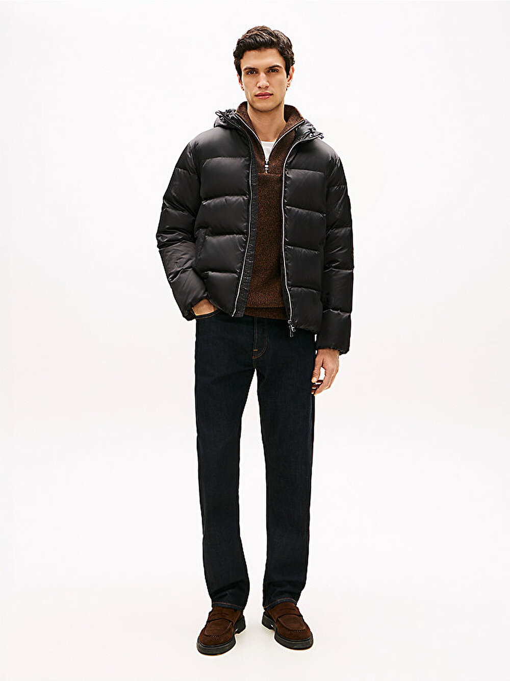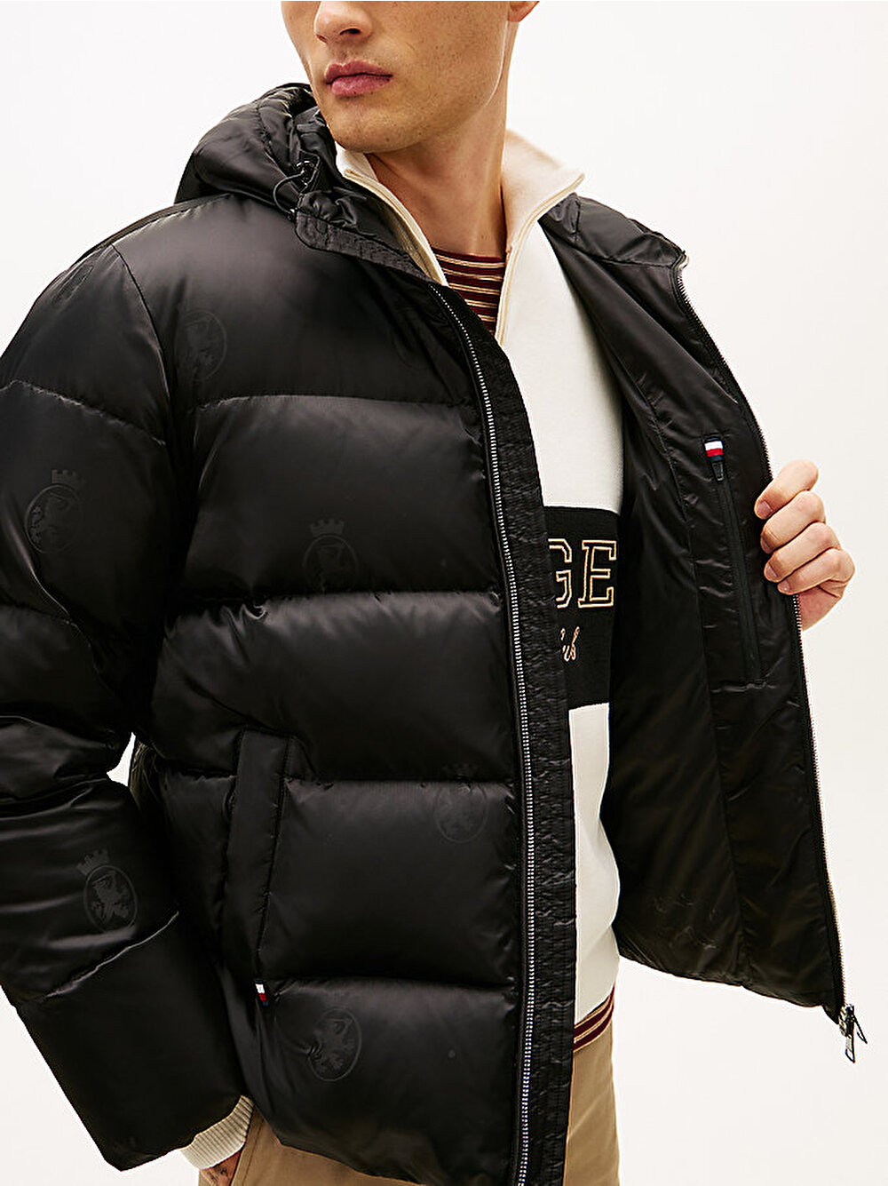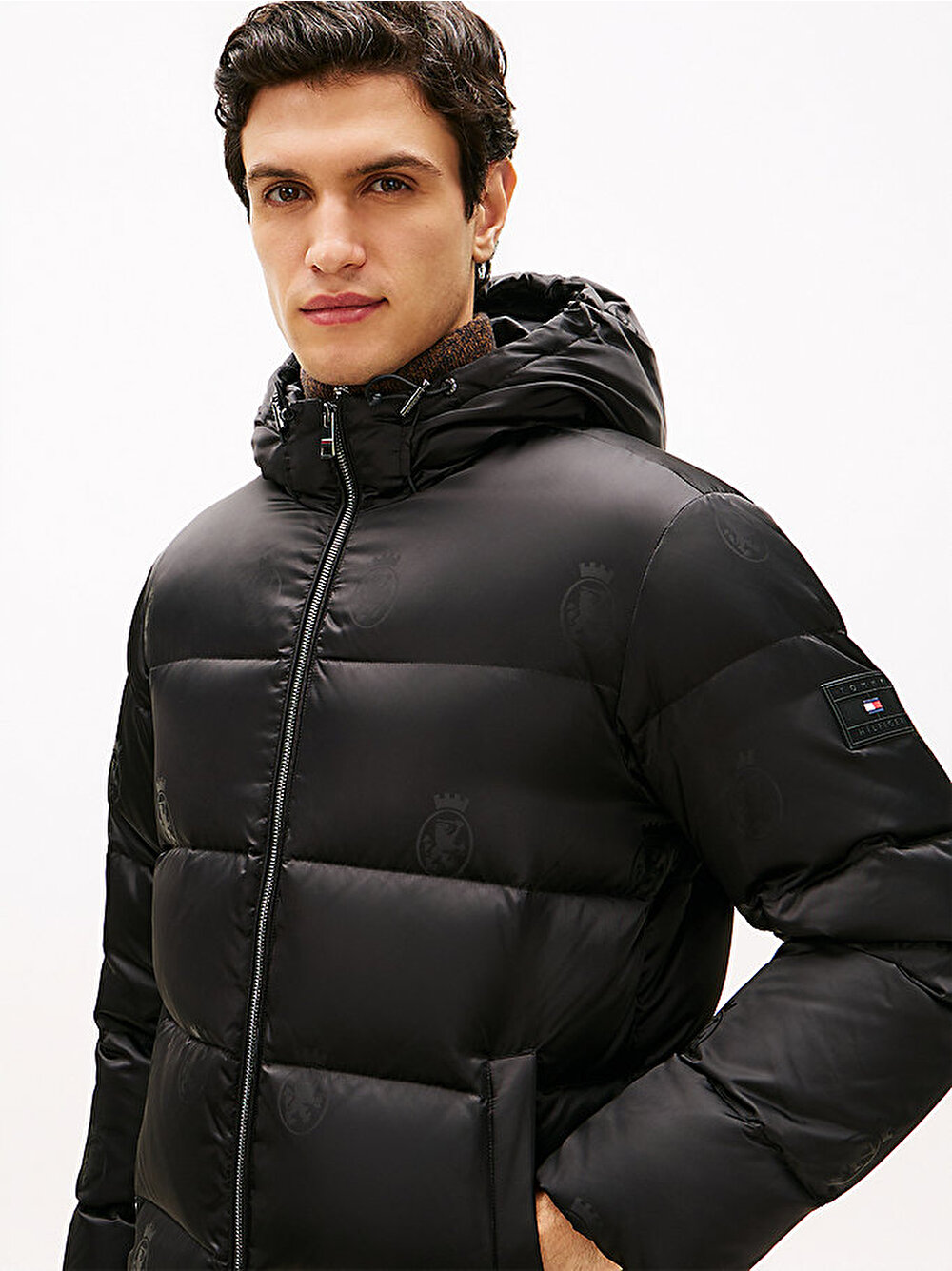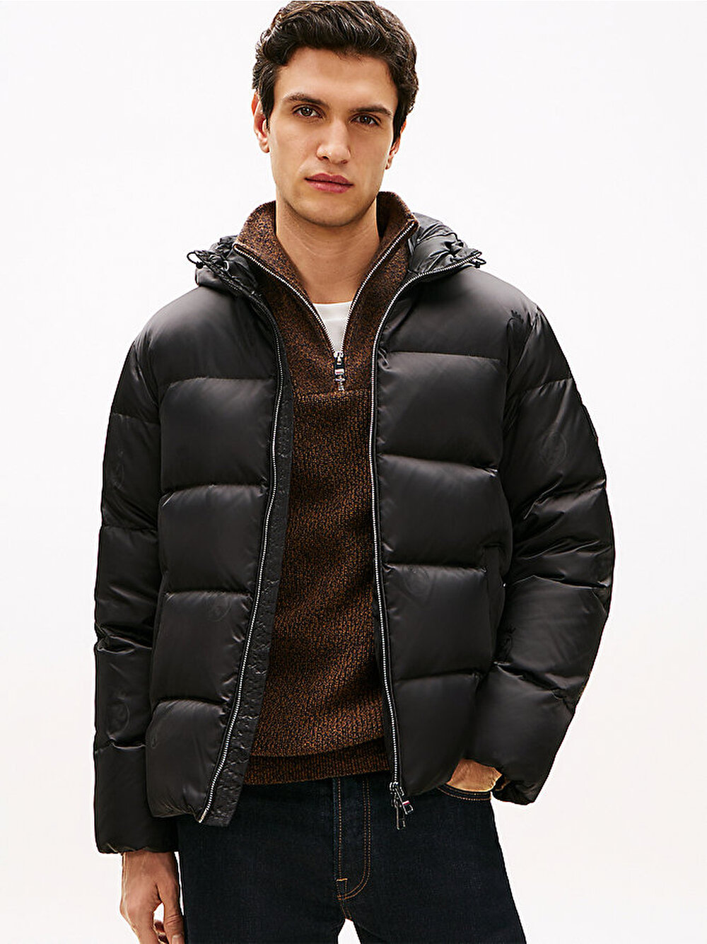 Sıcak kaz tüyü dolgusu ve baştan aşağı tonal TH armalı baskısıyla bu kapüşonlu şişme ceket, kış için mükemmel bir hediye tercihi.