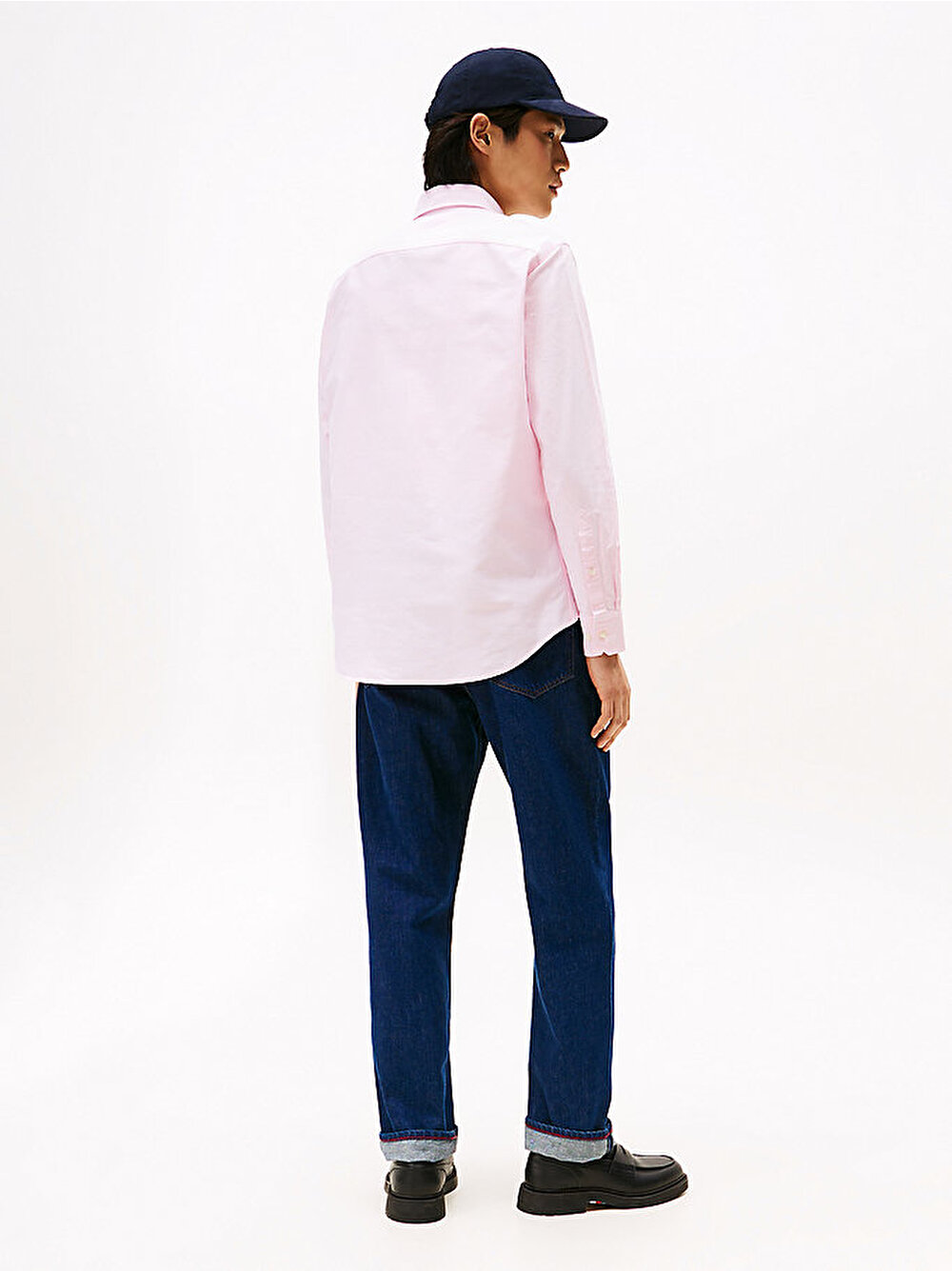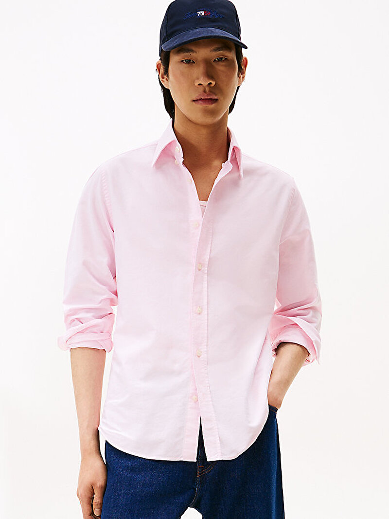 Bu Oxford gömlek, dikkat çekmeyen bayrak nakışıyla birlikte, köşeli manşetler ve düğmeli yakayla terzi işi net bir görünüm sunuyor.