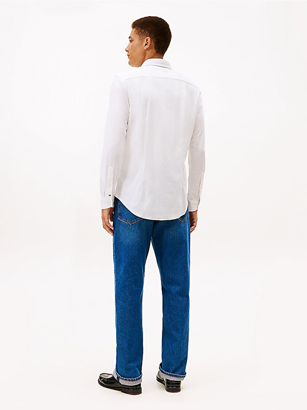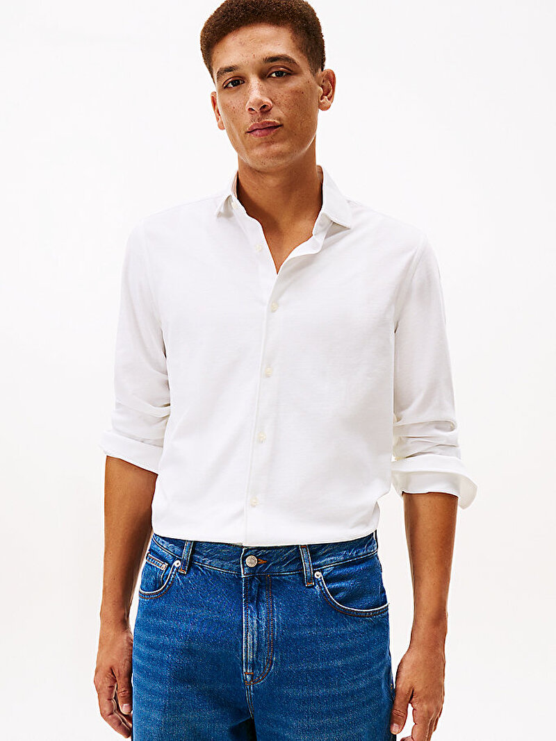 Bu gömlek, pürüzsüz ve yumuşak bir his için saf pamuklu jarse kumaştan üretilmiştir ve vücut hatlarını belirginleştiren bir slim-fit kesime sahiptir.
