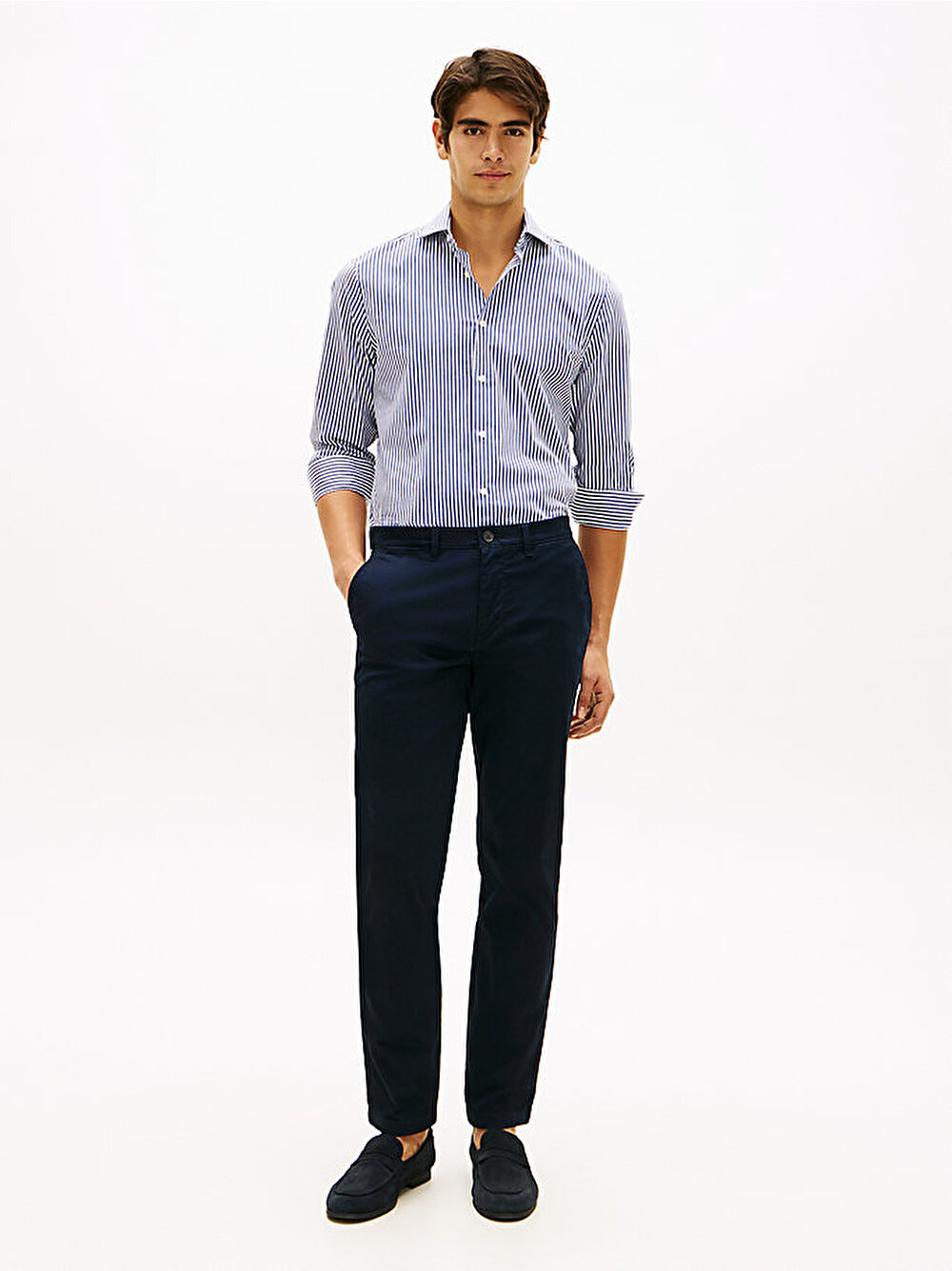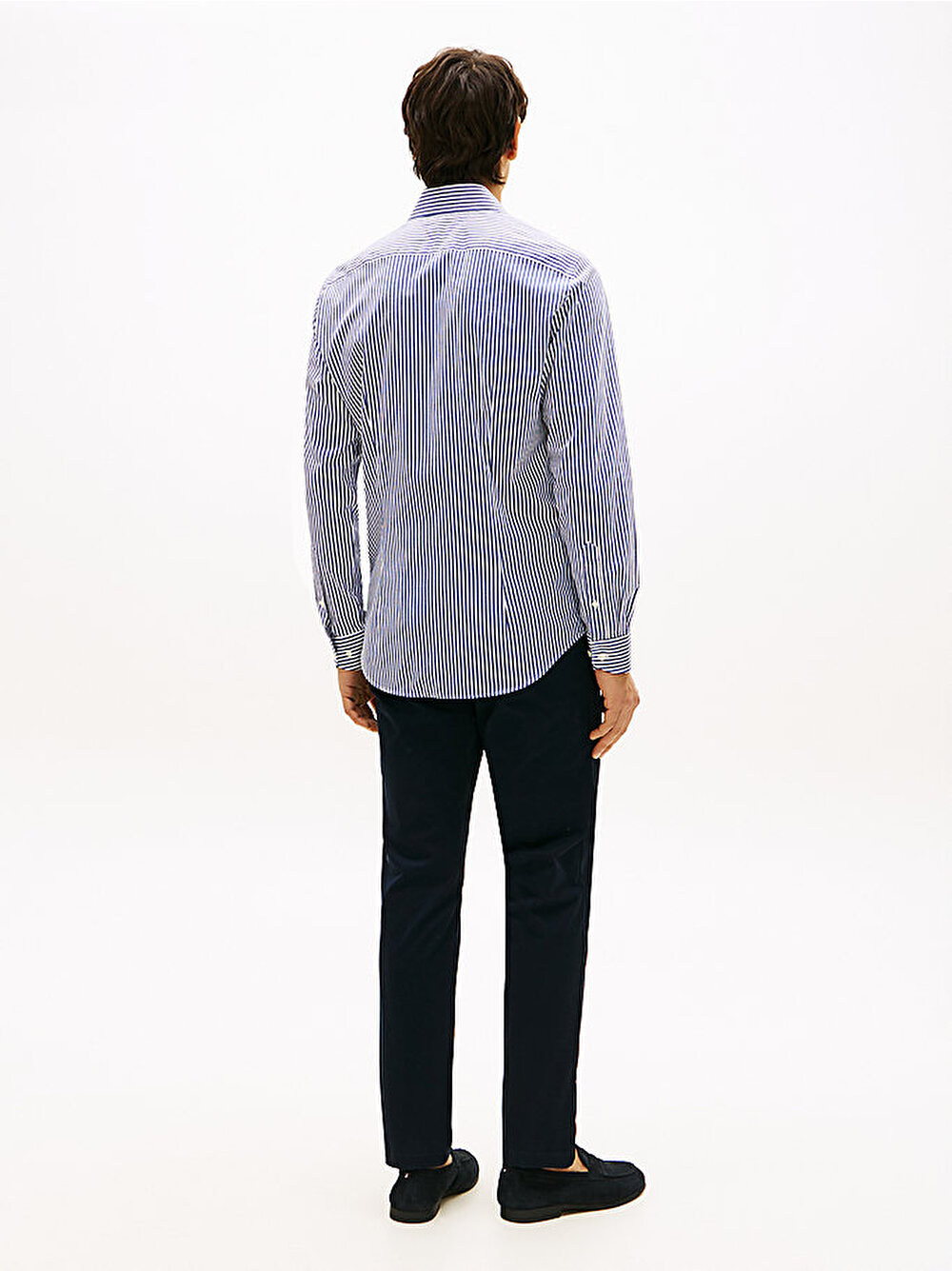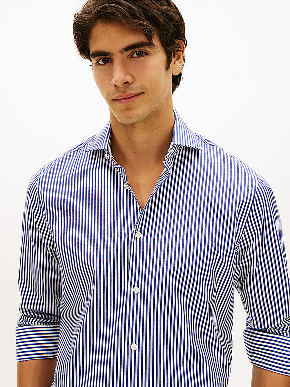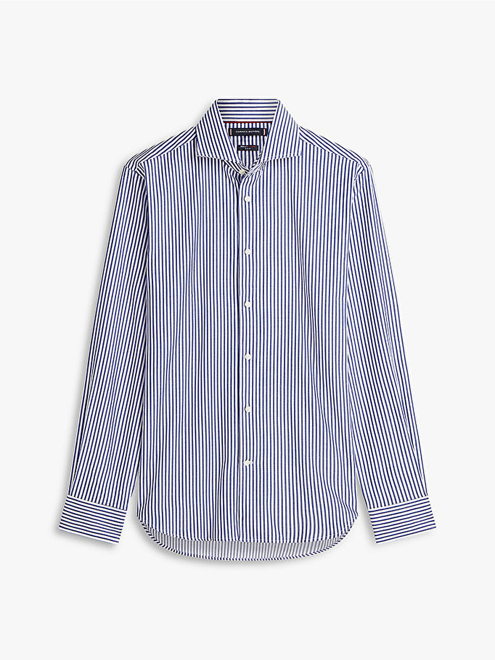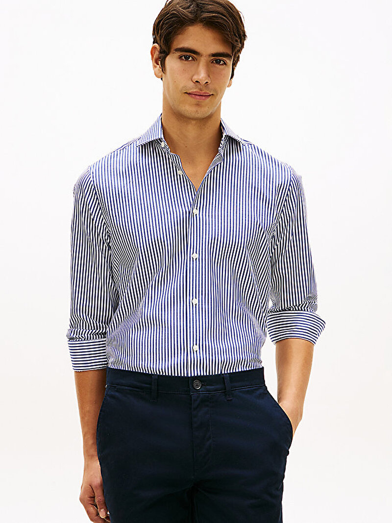 - Bu slim-fit çizgili gömlek, şık bir görünüm için ayrık cutaway yakaya sahipken, dört yöne esneme teknolojisi sayesinde rahat hareket imkanı sunuyor.