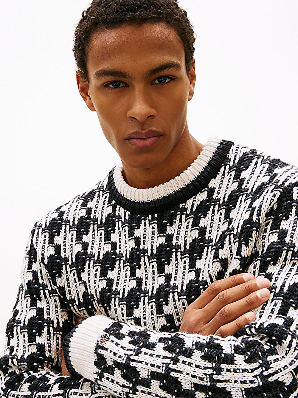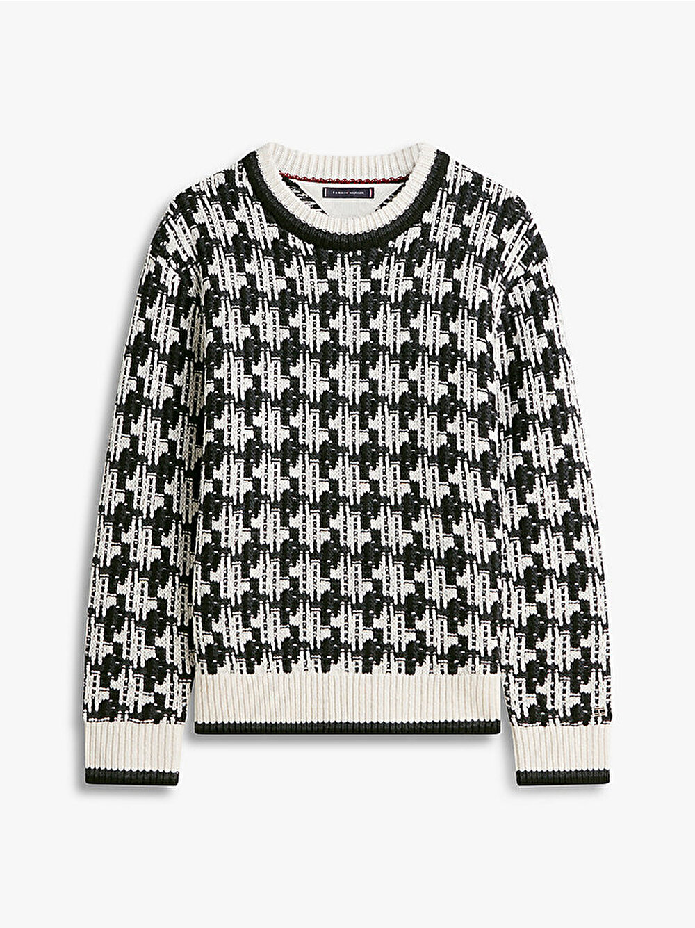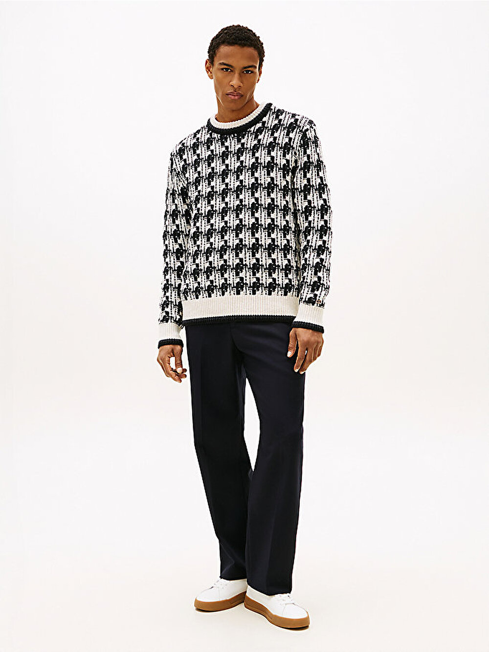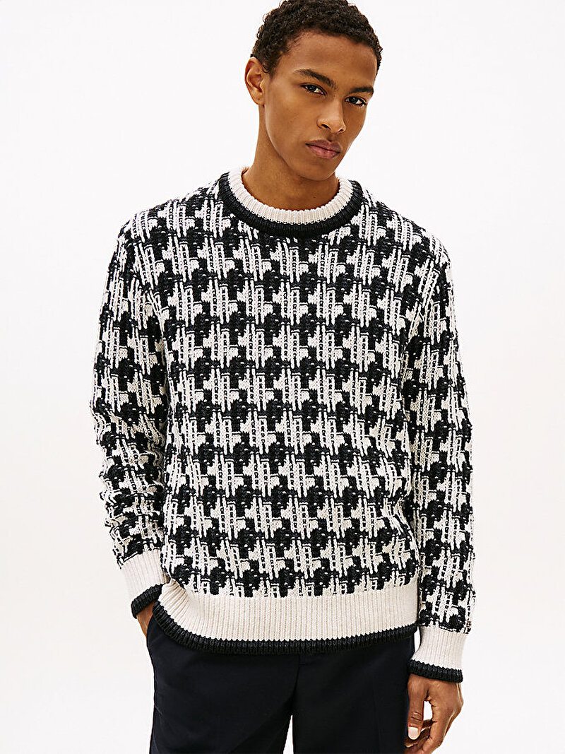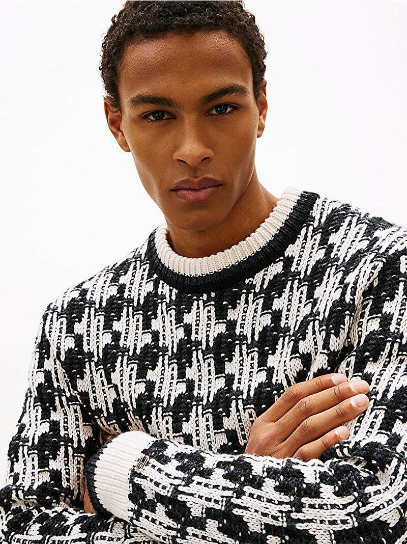 Bu kazakla kutlama havasına girin, çarpıcı bir görünüm için kalın bir dokuya sahip kontrast bir kazayağı desenle örülmüştür.