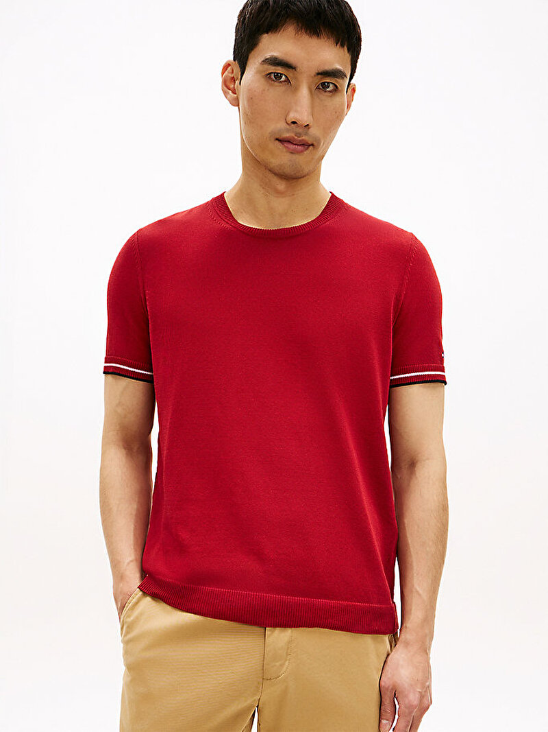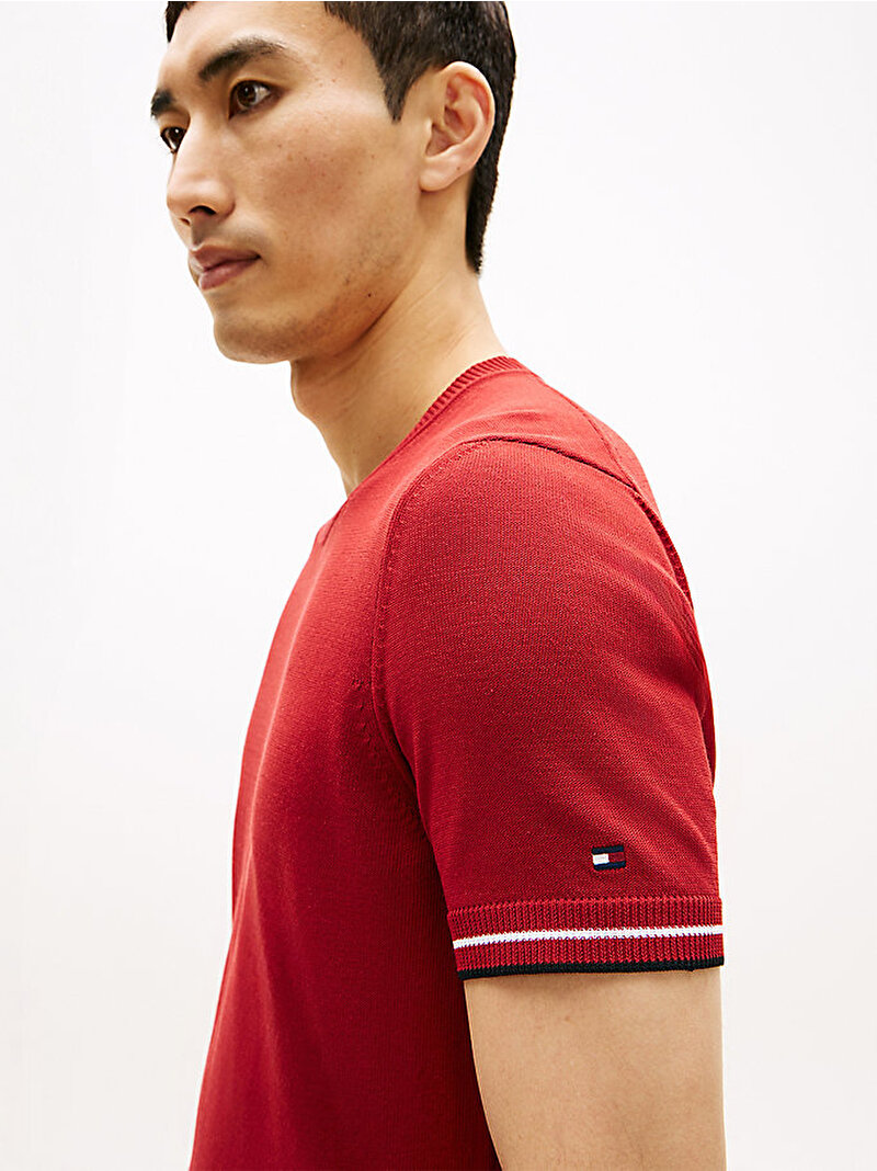 - Bu bisiklet yaka tişört, ikonik detaylı manşetlerle zenginleştirilen ilgi çekici bir silüet için pamuk karışımlı teknik örgü kumaştan üretilmiştir.