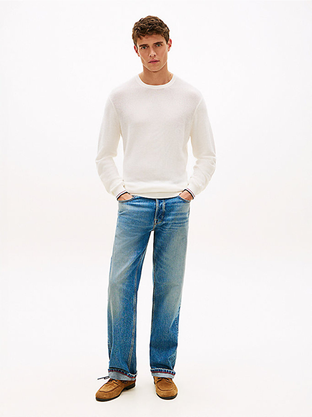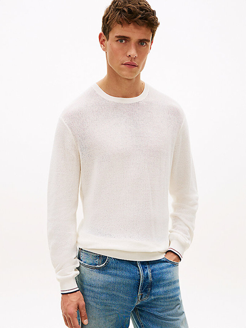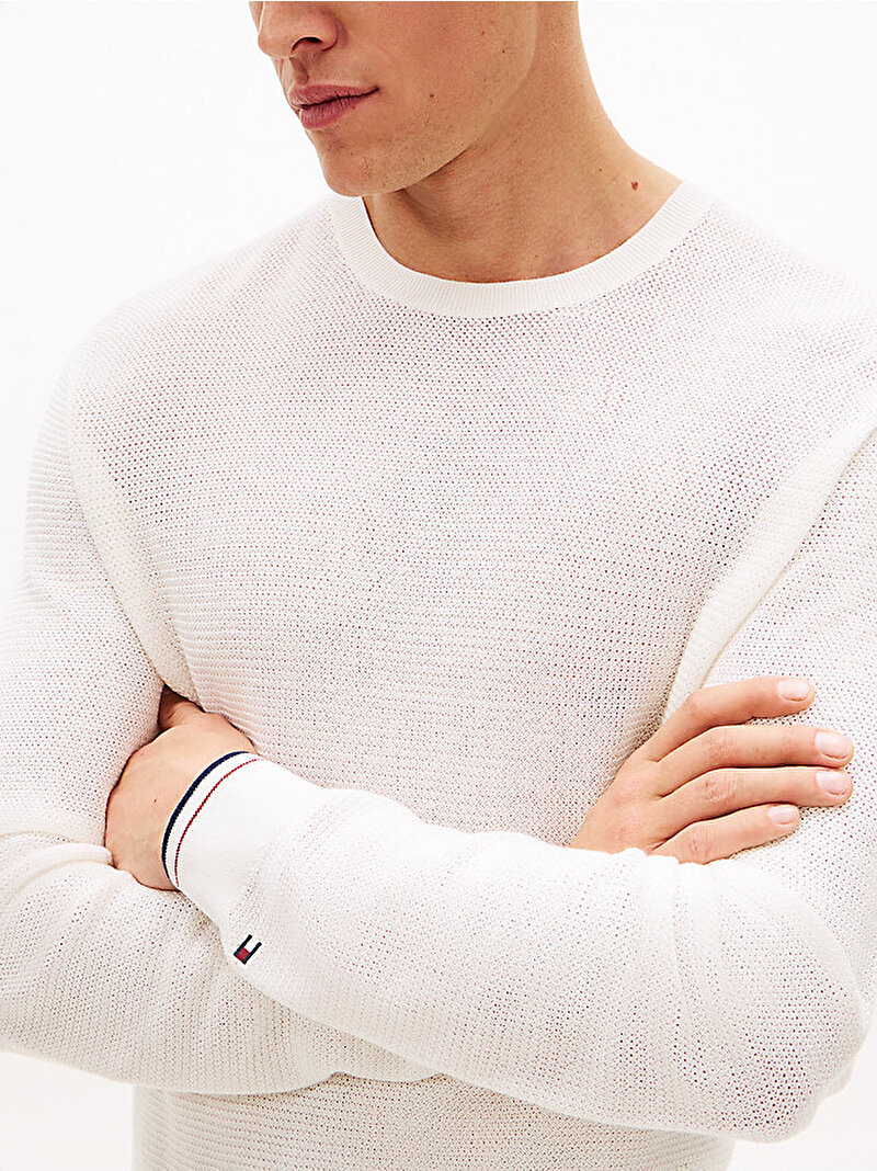 - Düşük omuz kesimine sahip bu waffle örgü bisiklet yaka kazak; koldaki nakışlı marka detayı ve biyeli manşetleriyle imza bir bitiş sunar.