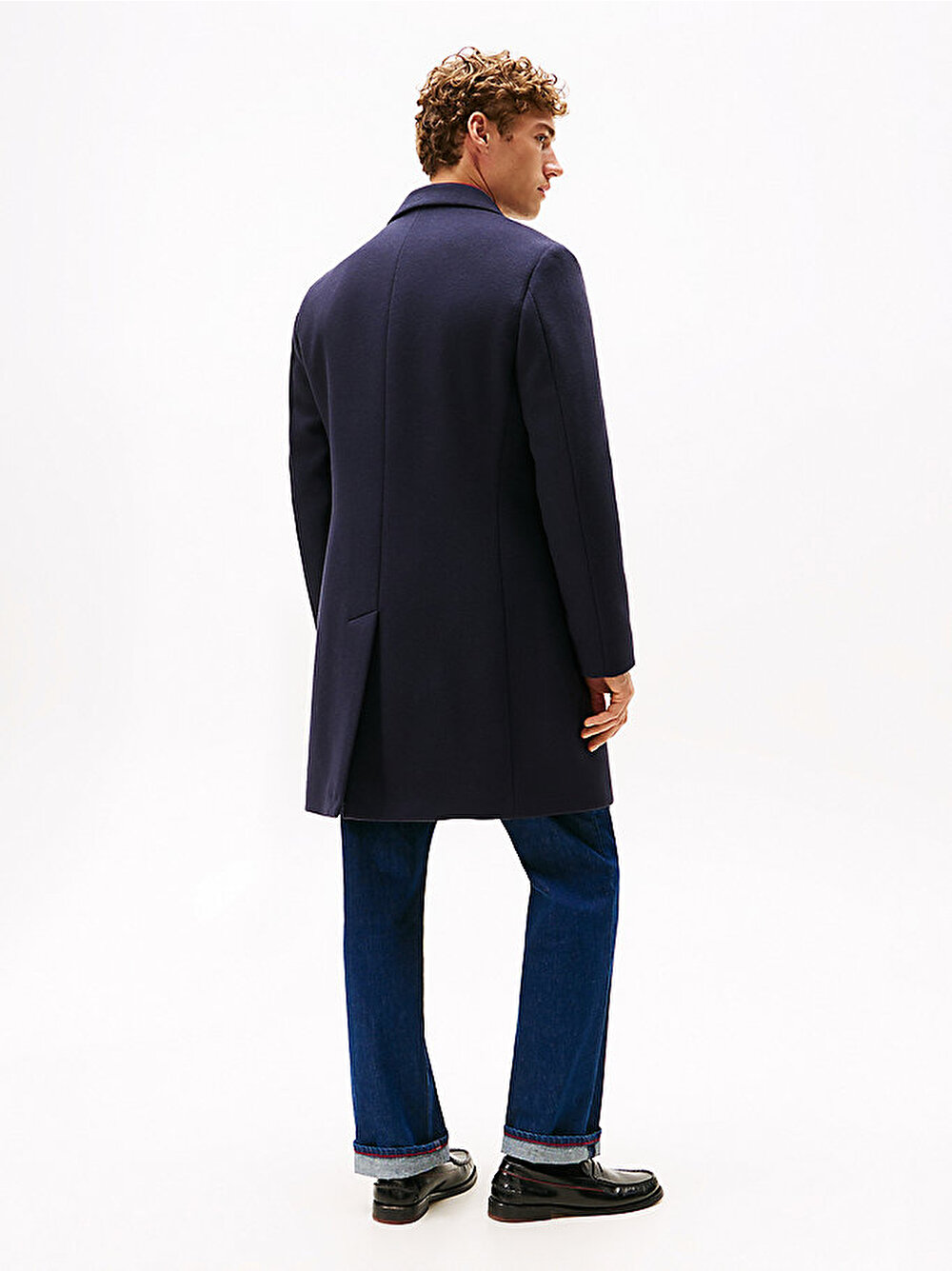 Bu rafine kaban, yün karışımlı kumaştan üretilmiş olup, sivri yakalarla ve bayrak plakalı bir iğneyle düzgünce tamamlanıyor.