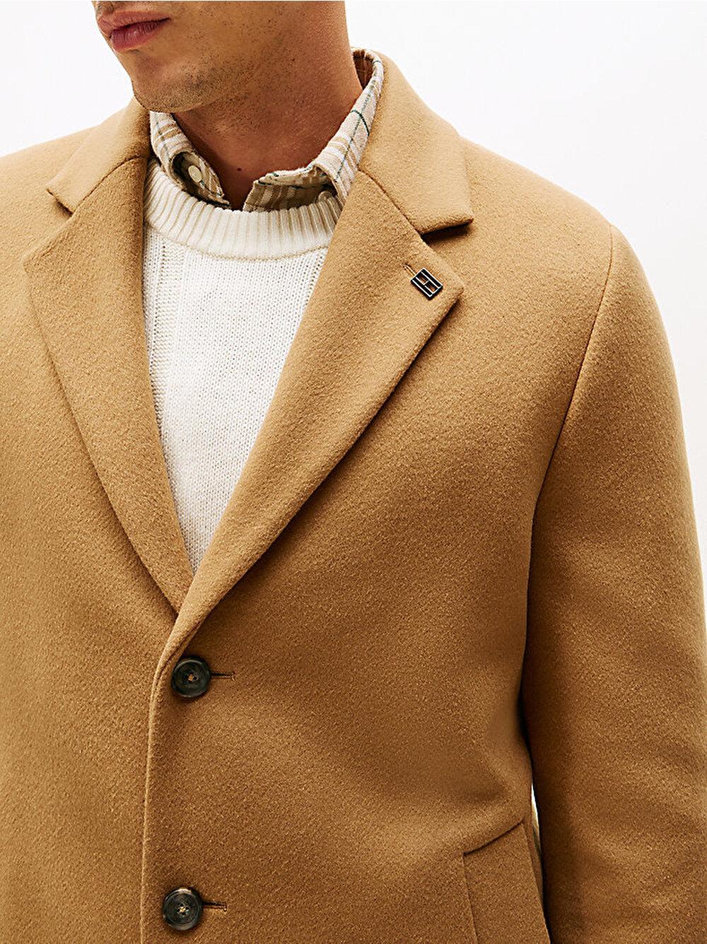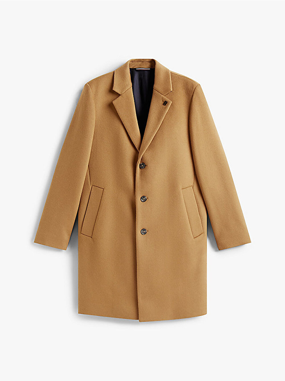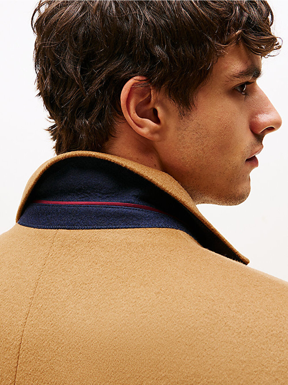 Bu rafine kaban, yün karışımlı kumaştan üretilmiş olup, sivri yakalarla ve bayrak plakalı bir iğneyle düzgünce tamamlanıyor.