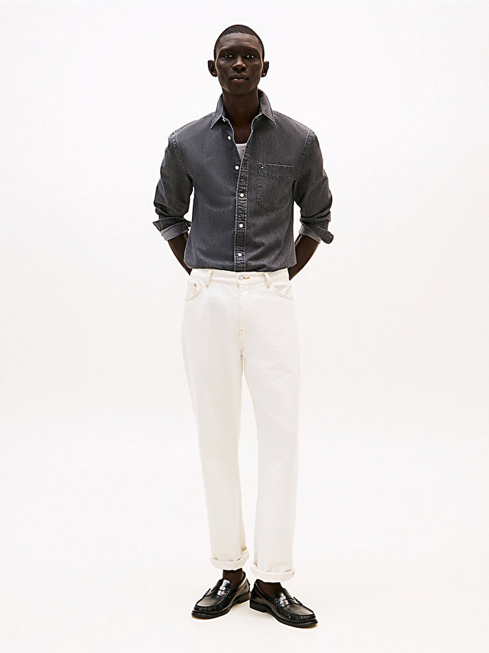 Klasik regular fit kesimli bu denim gömlek, bayrak nakışı detayıyla görünümünüze güçlü bir karakter kazandırır.