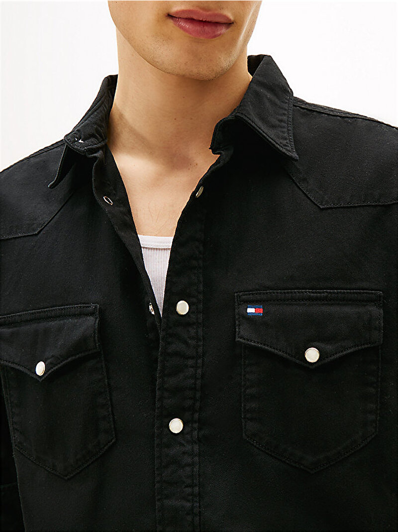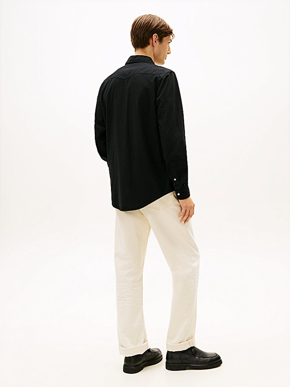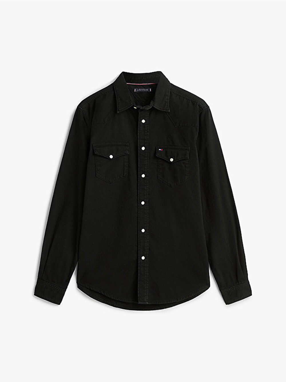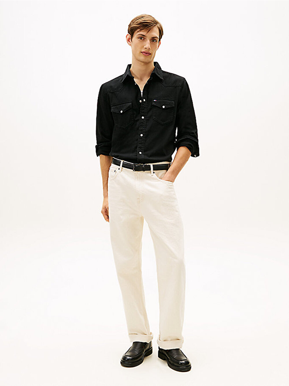 Bu western tarzı denim gömlek, doğal eskitilmiş bir görünüm için garment-dye işlemiyle renklendirilmiş olup omuz ve sırtta klasik dikiş detaylarına sahiptir.