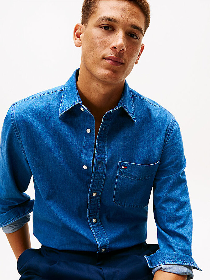 Klasik regular fit kesimli bu denim gömlek, bayrak nakışı detayıyla görünümünüze güçlü bir karakter kazandırır.