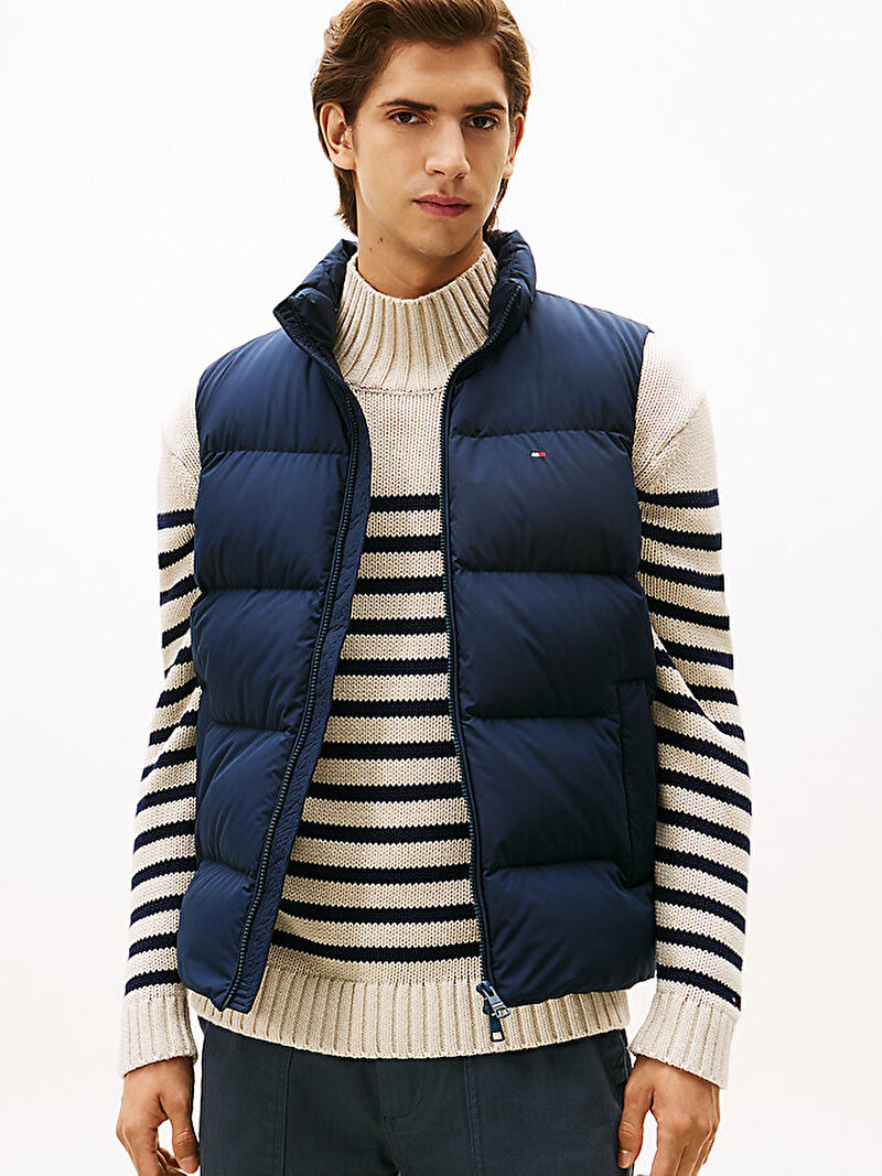 Dik yakalı ve kaz tüyü dolgulu yapısıyla bu su tutmayan şişme yelek, kuru havalarda sıcak kalmanızı sağlar.