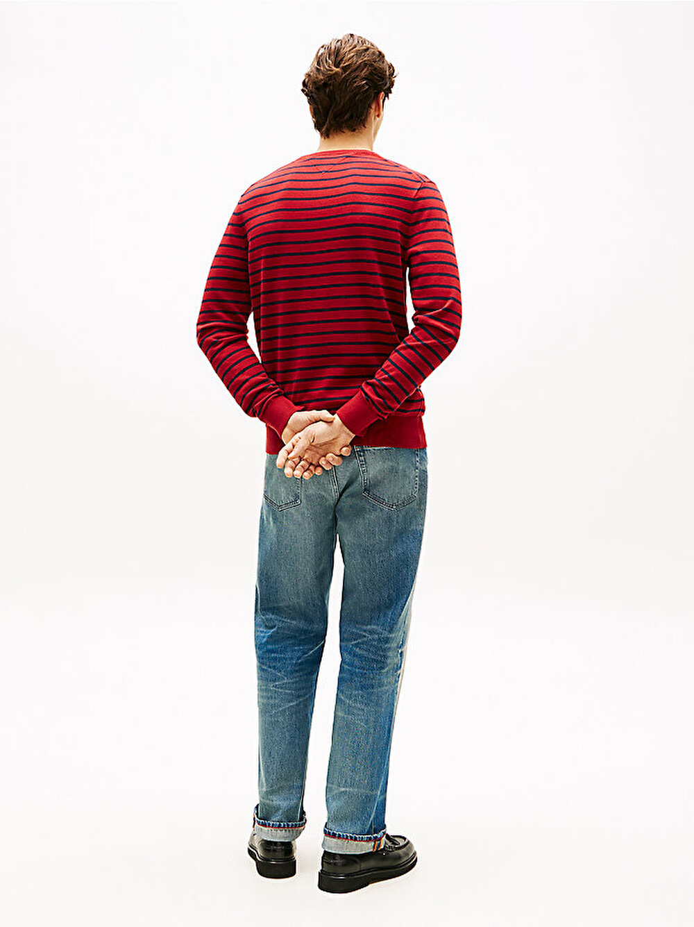 - İster tek başına ister bir dış katman olarak kullanılsın; bu saf penye pamuklu bisiklet yaka kazak, serin günler için klasik bir görünüm sağlar.