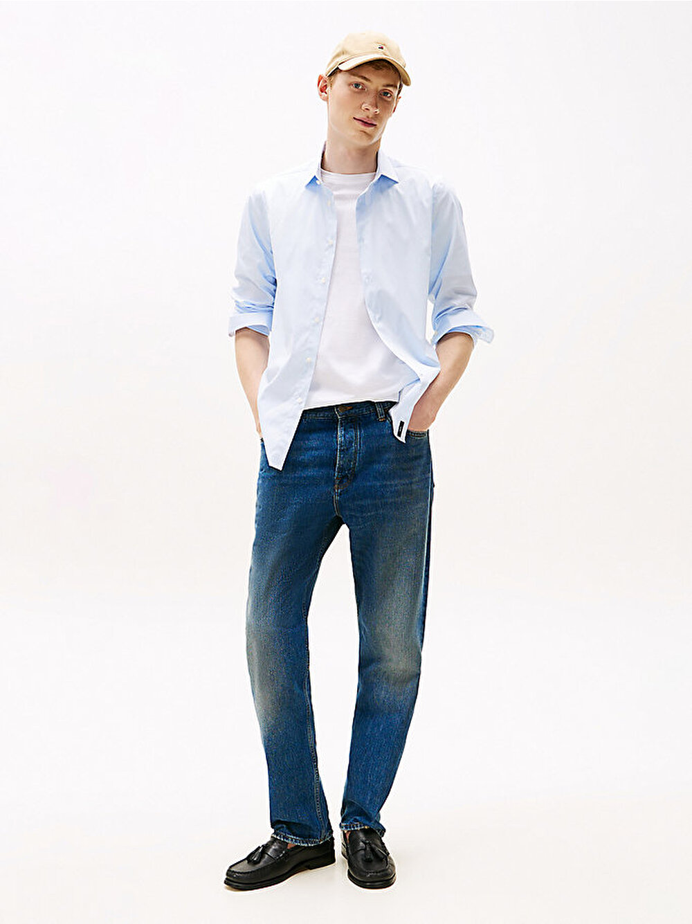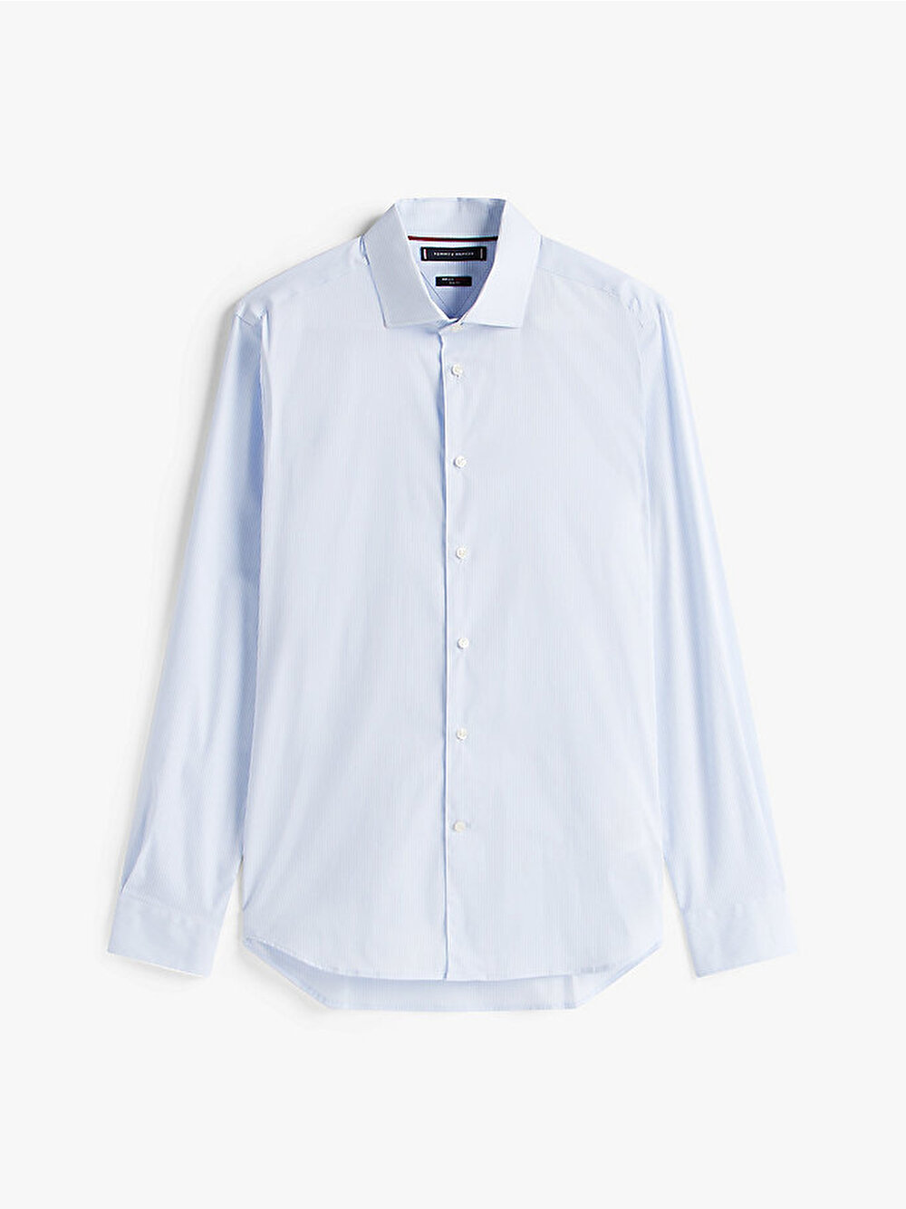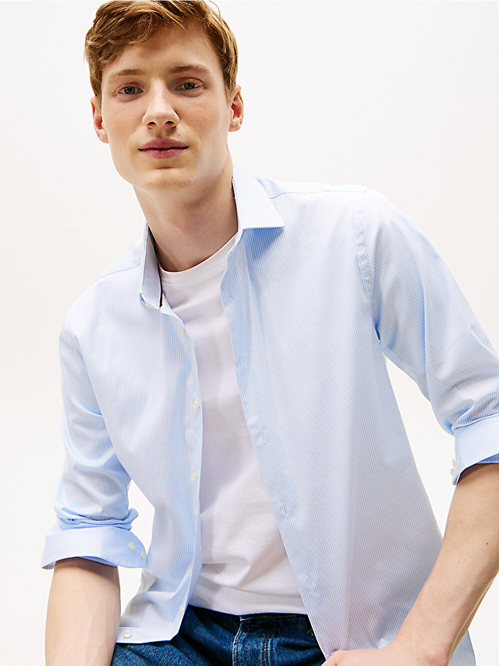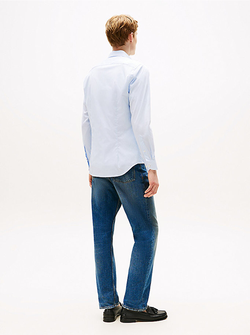 Dört yönlü esneme teknolojisiyle üretilen ve yayvan yaka ile tamamlanan bu dar kesim gömlek, keskin görünümü kolayca hareket etme özelliğiyle birleştiriyor.