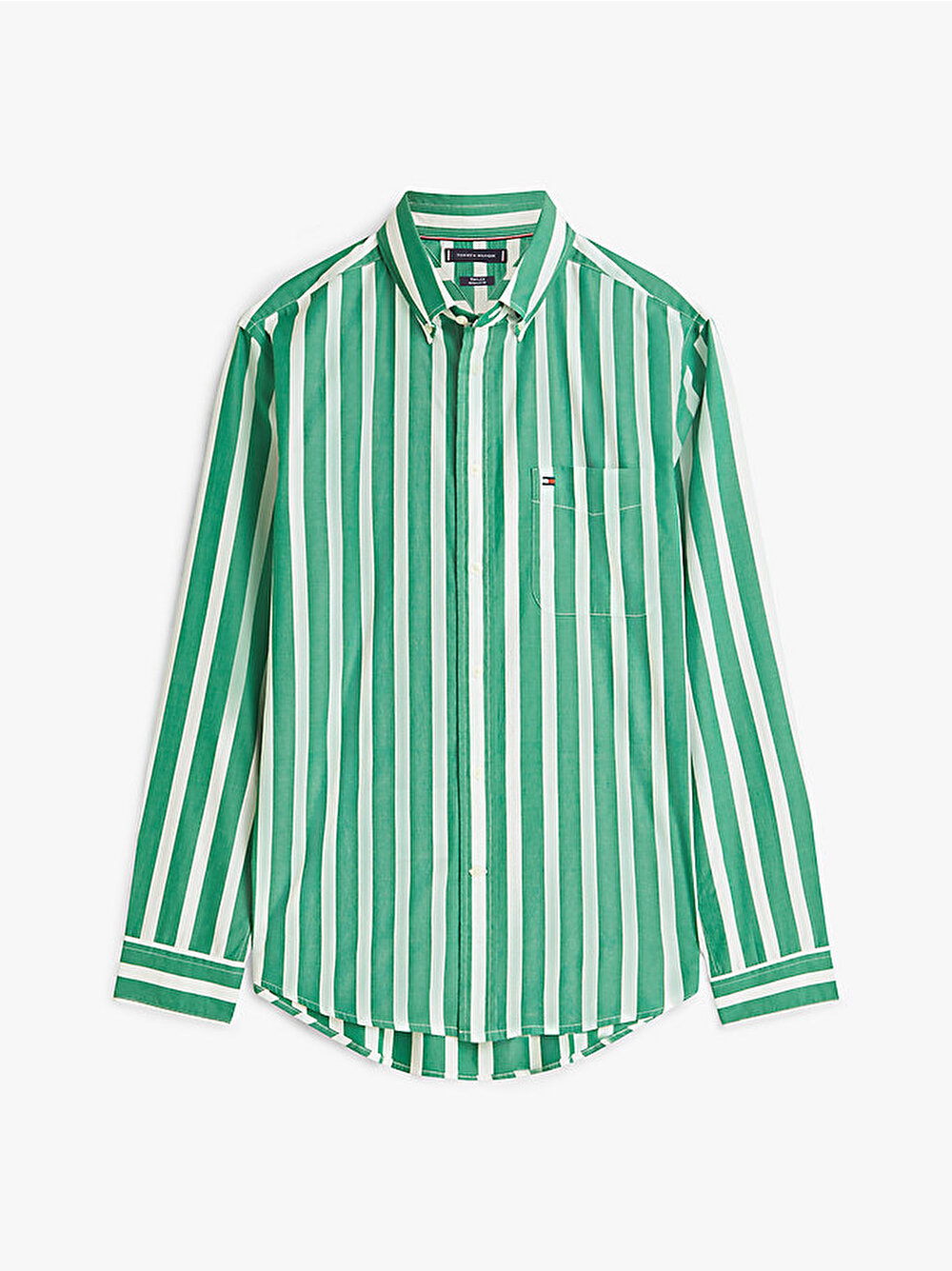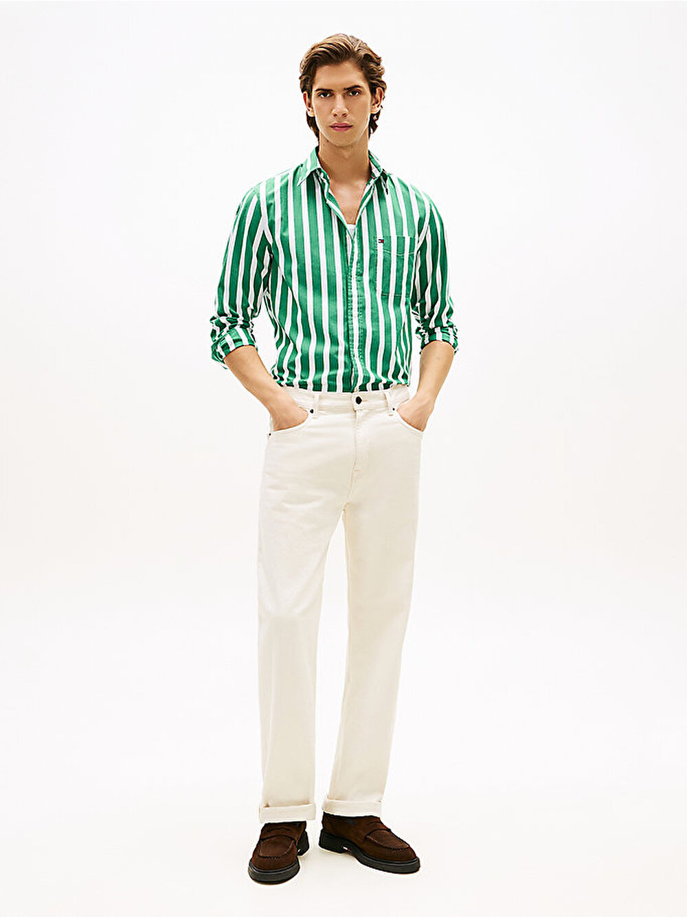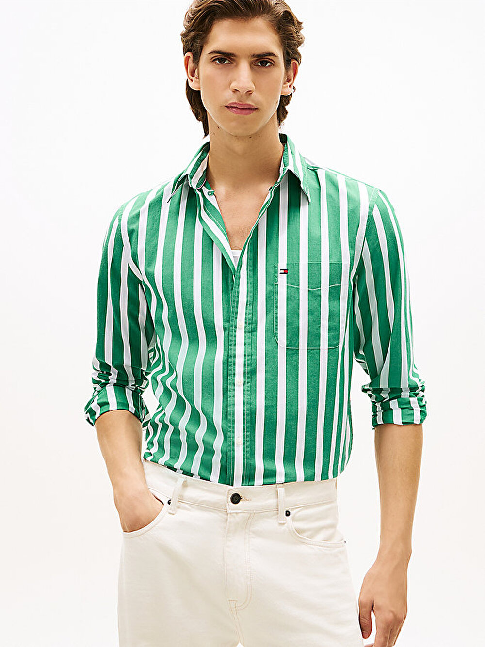 Cesur çizgili deseniyle dikkat çeken bu saf pamuklu poplin kumaştan düğmeli gömlek, dört yönlü esneme teknolojisi sayesinde gün boyu kullanım için mükemmeldir.