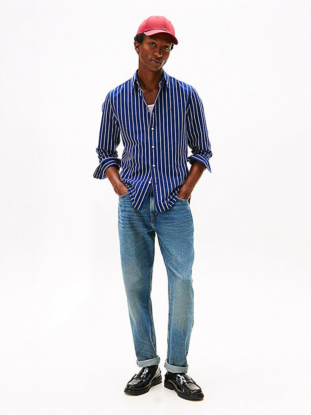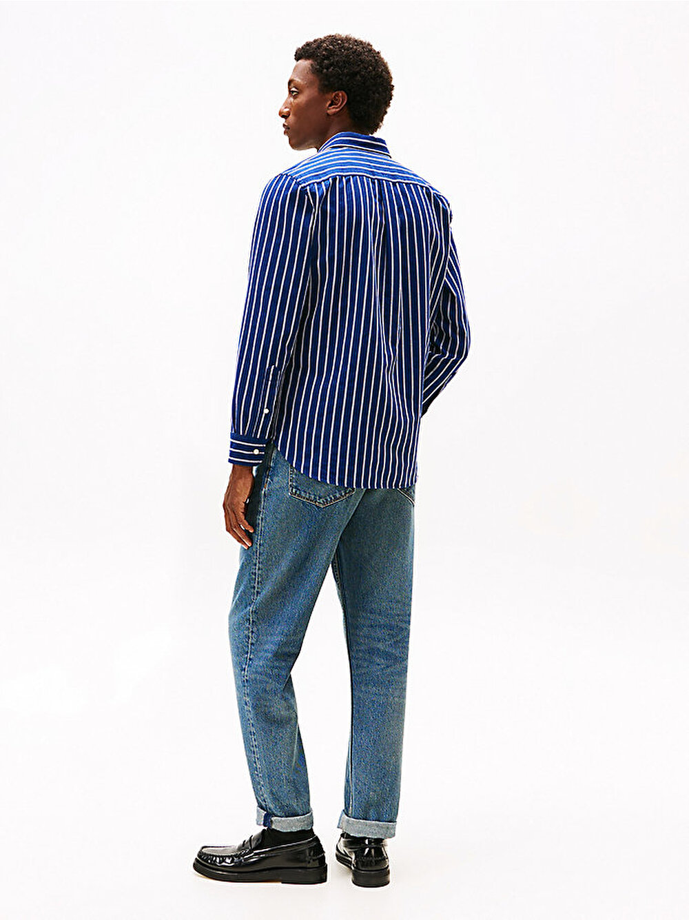 Dikey çizgili tasarımıyla dikkat çeken bu Oxford pamuk armürlü gömlek, zamansız düğmeli yaka ve sade logo nakışıyla tamamlanıyor.