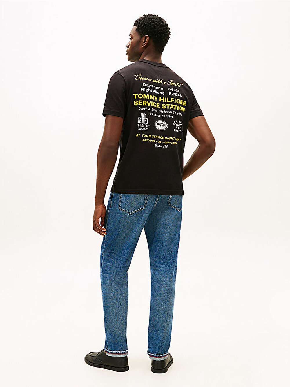 Bu rahat kesim T-shirt, sırtındaki dikkat çekici servis istasyonu marka grafiğiyle retro iş kıyafeti esintili bir görünüm sunar.