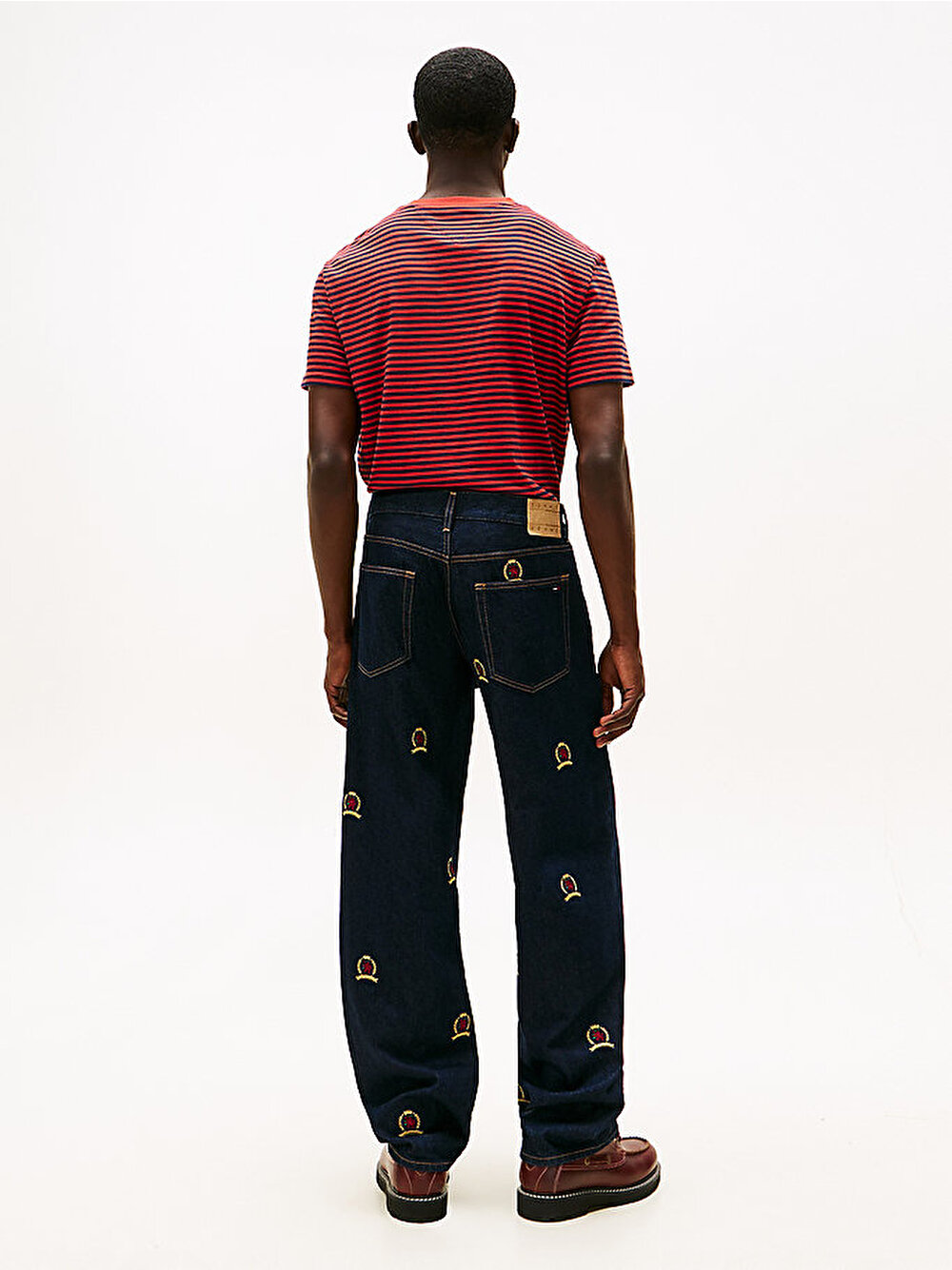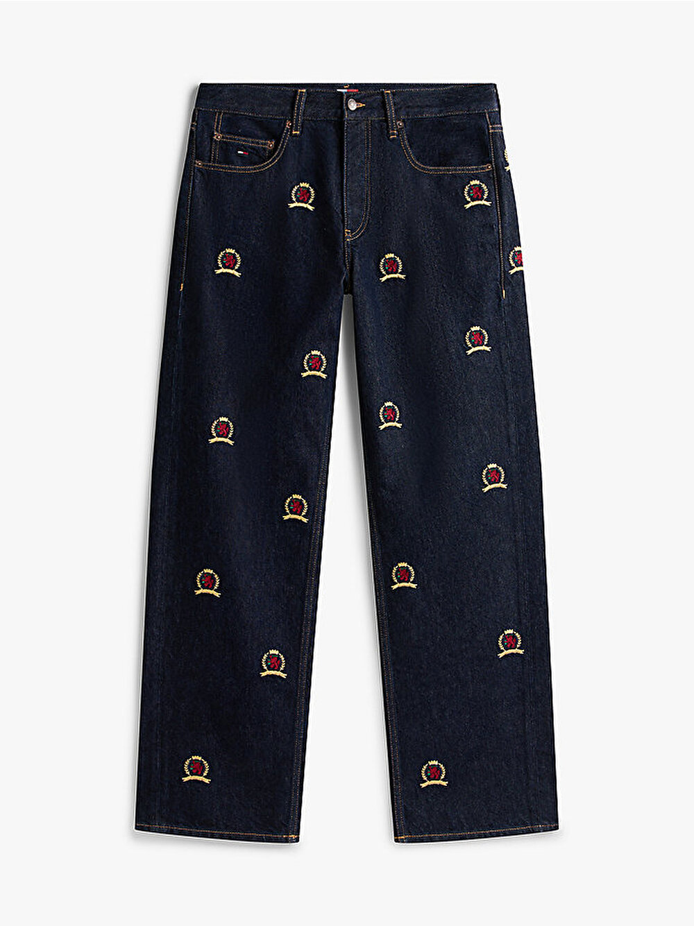 Baştan aşağı arma nakışlarla kaplı regular-fit kesimli ve çok yönlü düz paça bu jean pantolon, günlük görünümünüz için göz alıcı bir seçimdir.