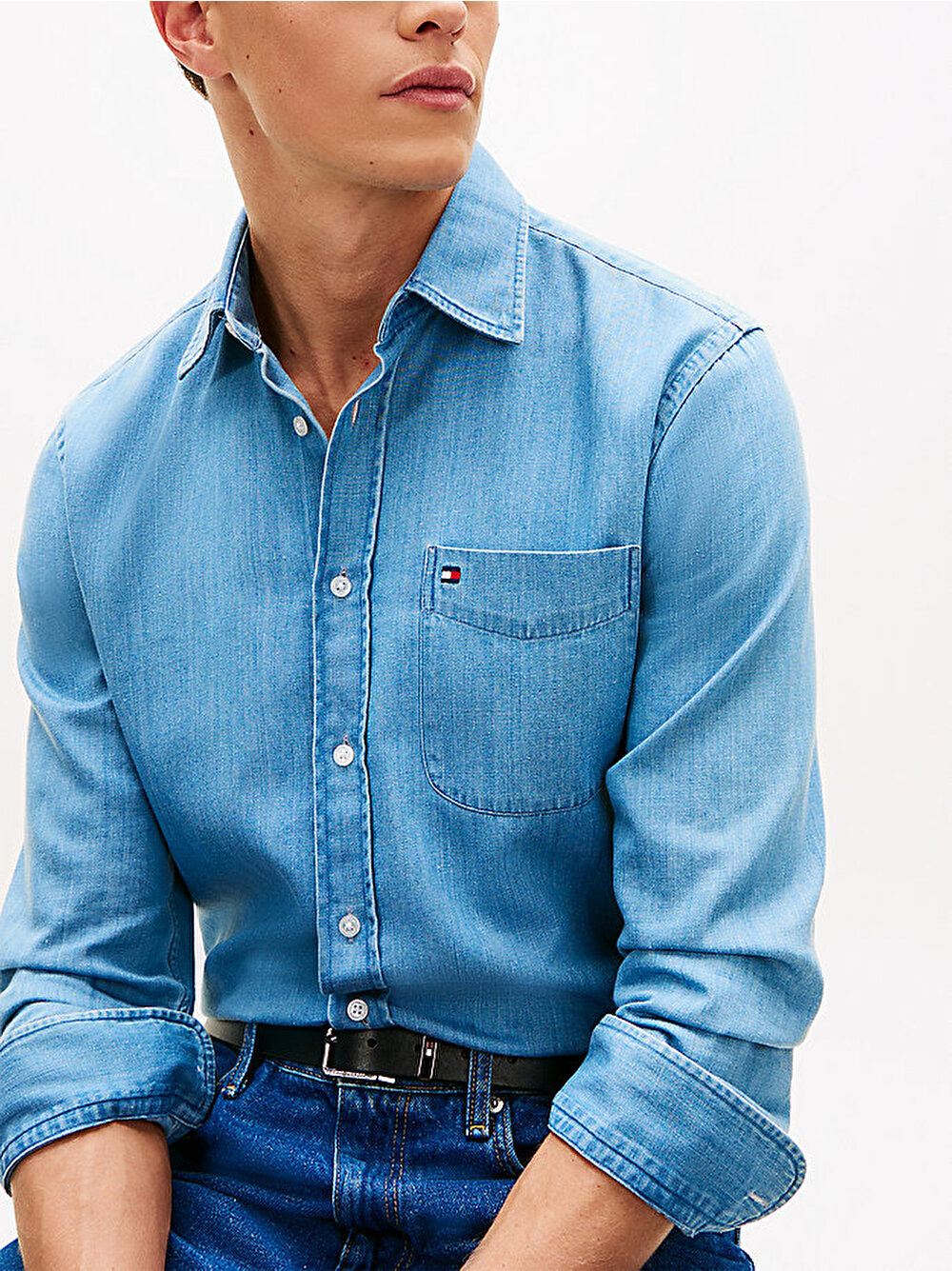- Bayrak nakışlı göğüs cebiyle tamamlanan bu hafif denim gömlek ile hafta sonu kombinlerinize "Western" esintili bir hava ekleyin.