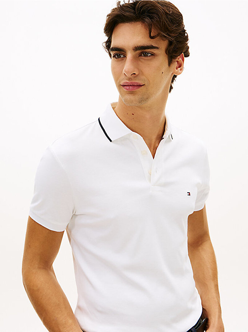 - Saf pamuklu interlok örgüden üretilen bu slim-fit polo tişört, zarif bir silüet için yumuşak ve pürüzsüz bir yüzey sunuyor.