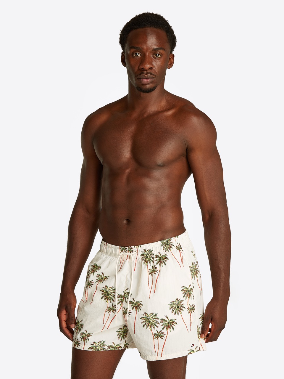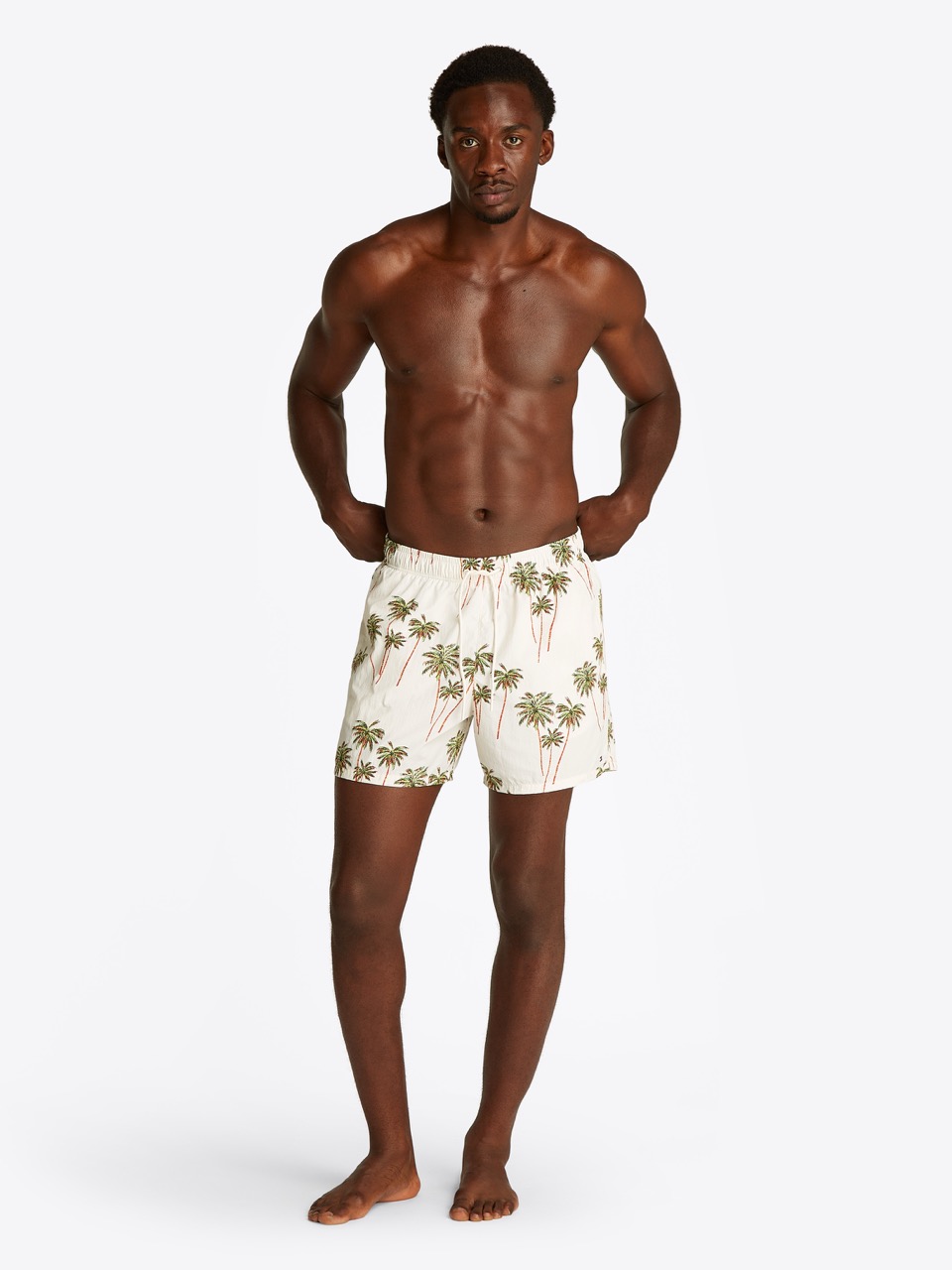 Tamamı dikkat çekici bir desenle kaplanmış ve zarif marka detaylarıyla tamamlanmış bu orta boy yüzme şortu, havuz kenarındaki stilinize imza niteliği kazandırıyor.