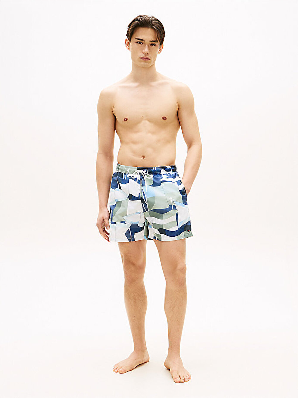 - Dikkat çekici boydan boya deseni ve kullanışlı cepleriyle bu orta boy deniz şortu, tatil gardırobunuza iddialı bir dokunuş katıyor.