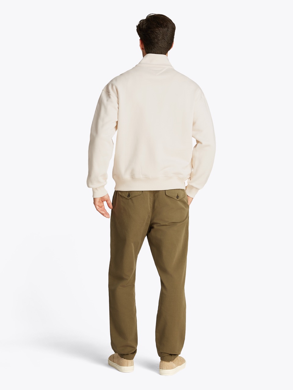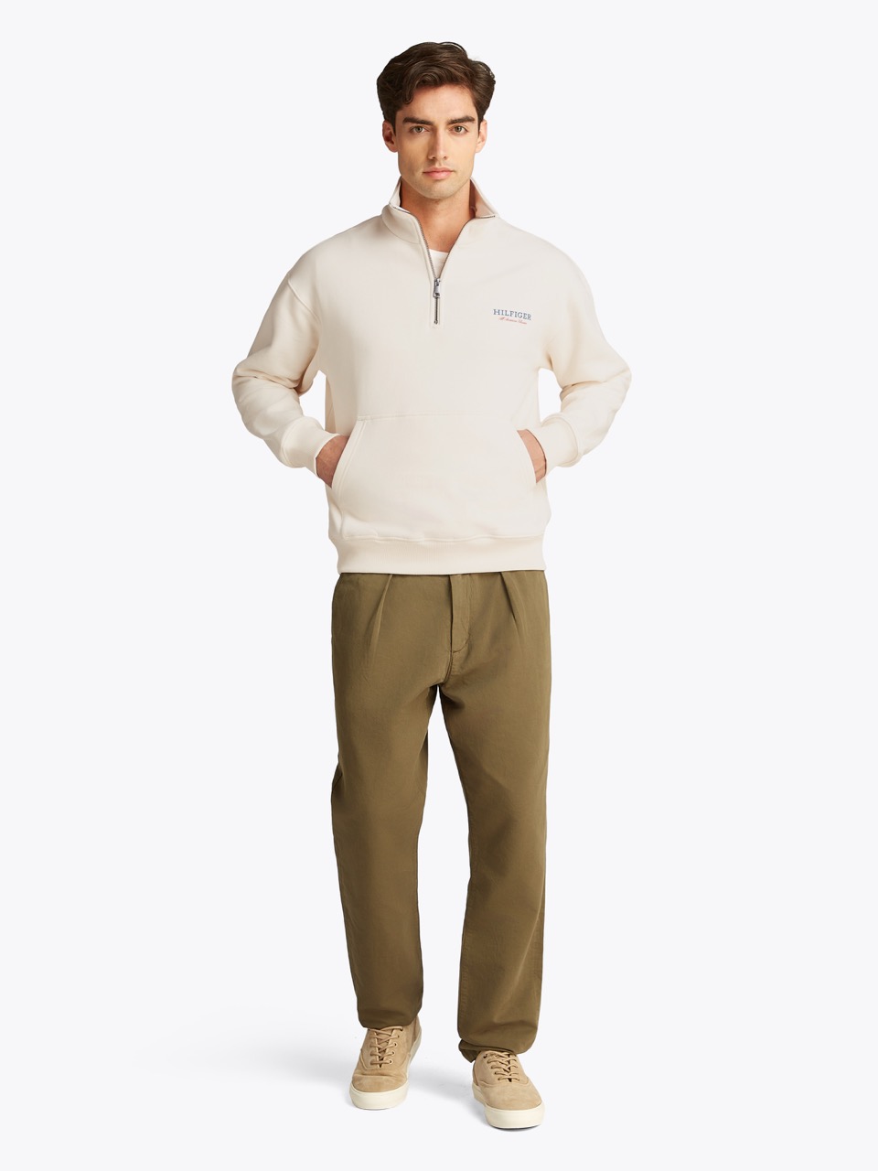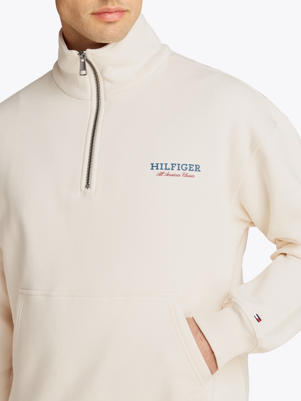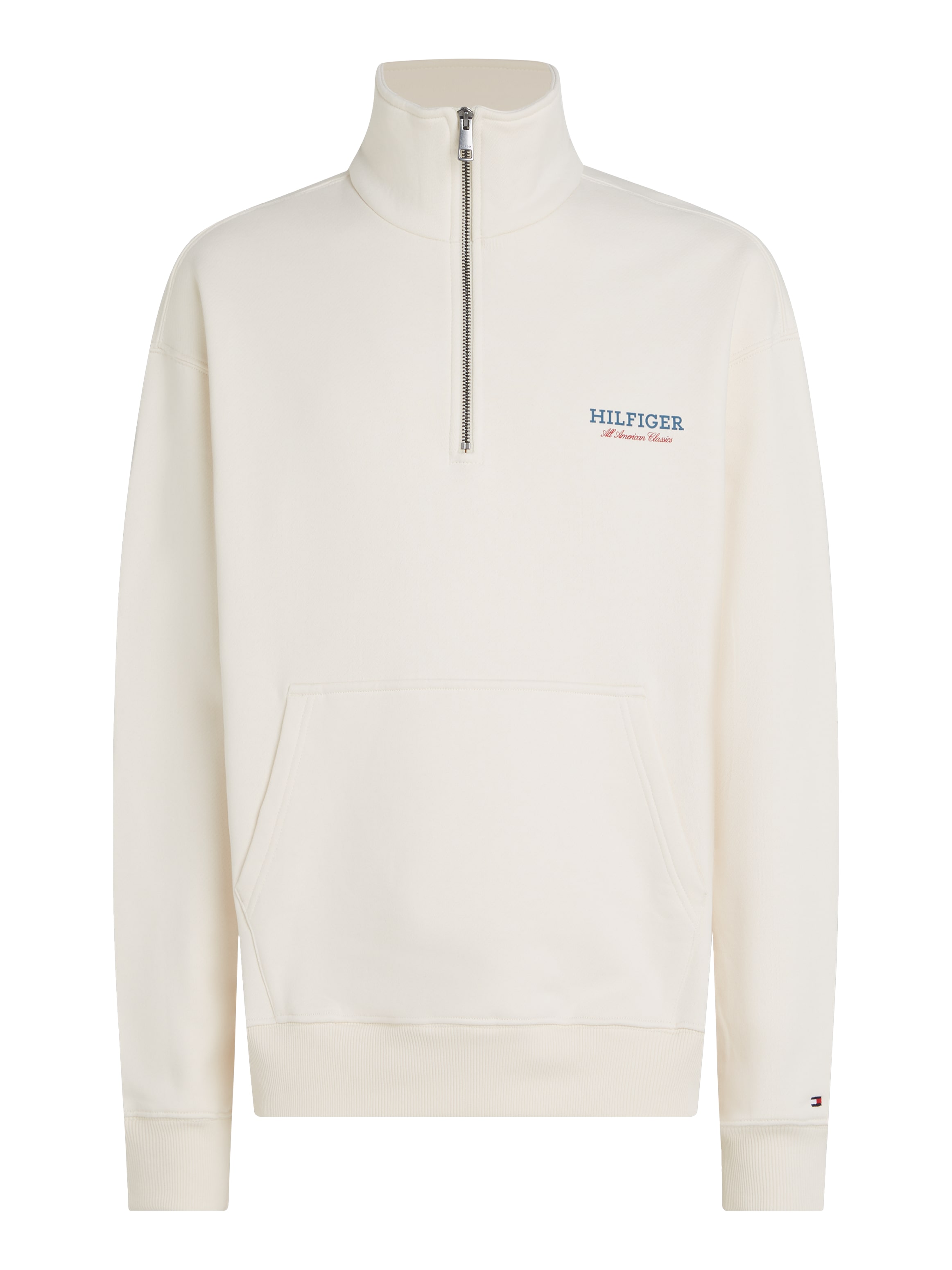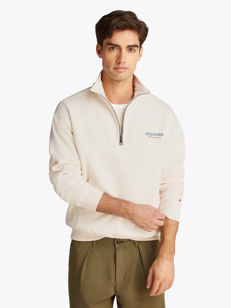 Tommy Hilfiger’dan yarım fermuarlı sweatshirt. Bu sweatshirt, rahat kesimi ve yarım fermuarlı yakasıyla konforlu bir görünüm sunuyor.