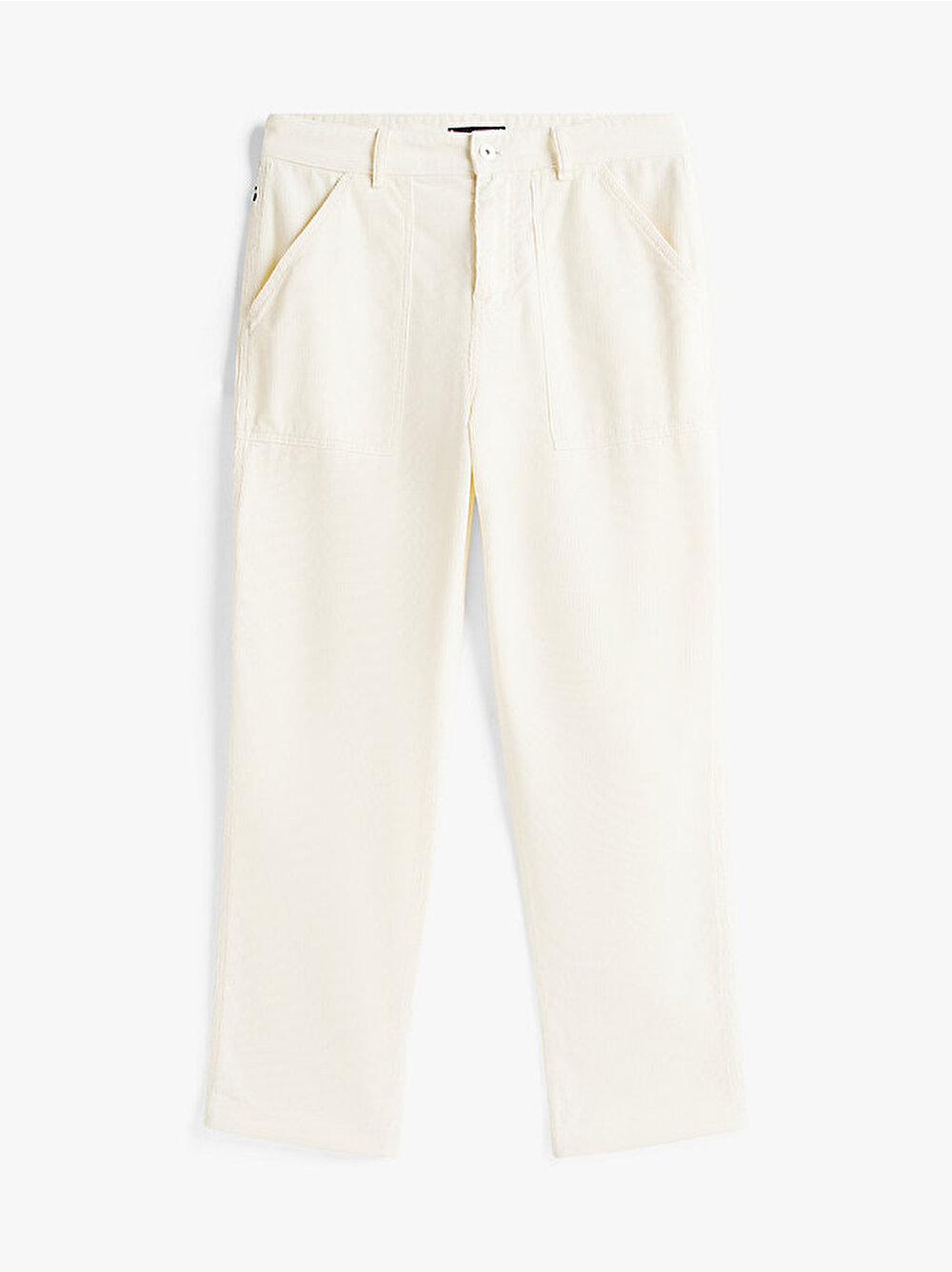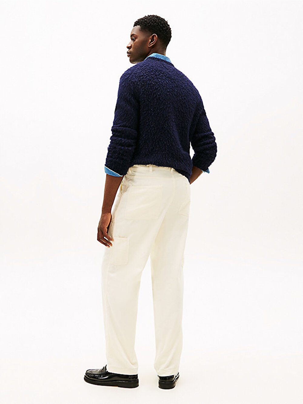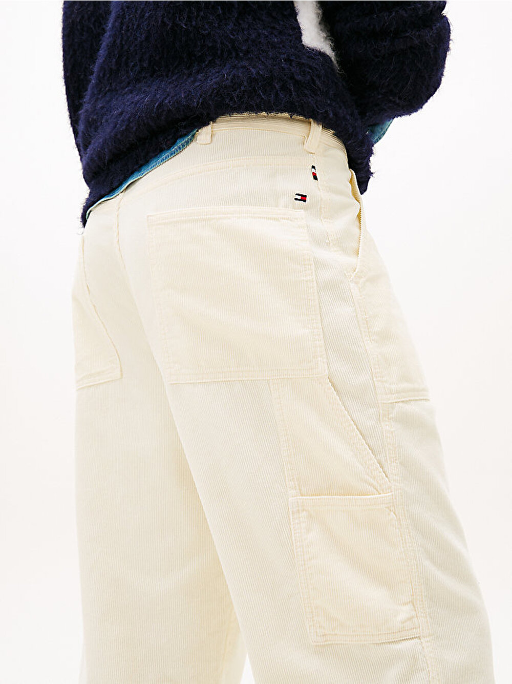 Bu giysi boyalı saf pamuk fitilli kadife chino pantolon, marangoz tipi cepleriyle klasik pantolon stiline daha rahat bir yorum katar.