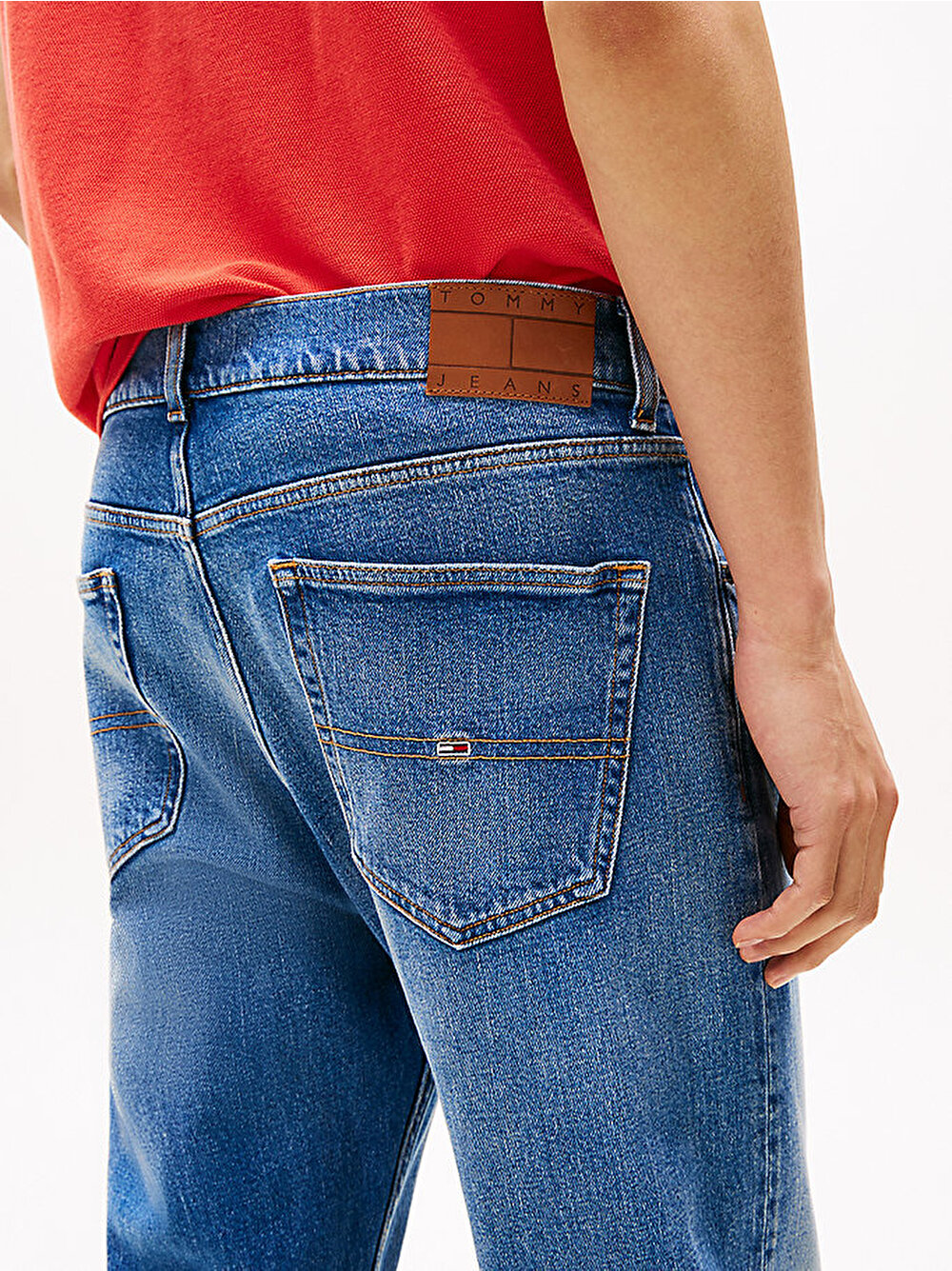 Aerodinamik düz paçaya ve yaşanmış bir hava için hafif soluk görünüme sahip bu yıpranmış çizgi efektli jean pantolon ile trend görünümünüzü koruyun.