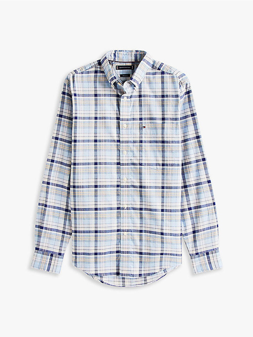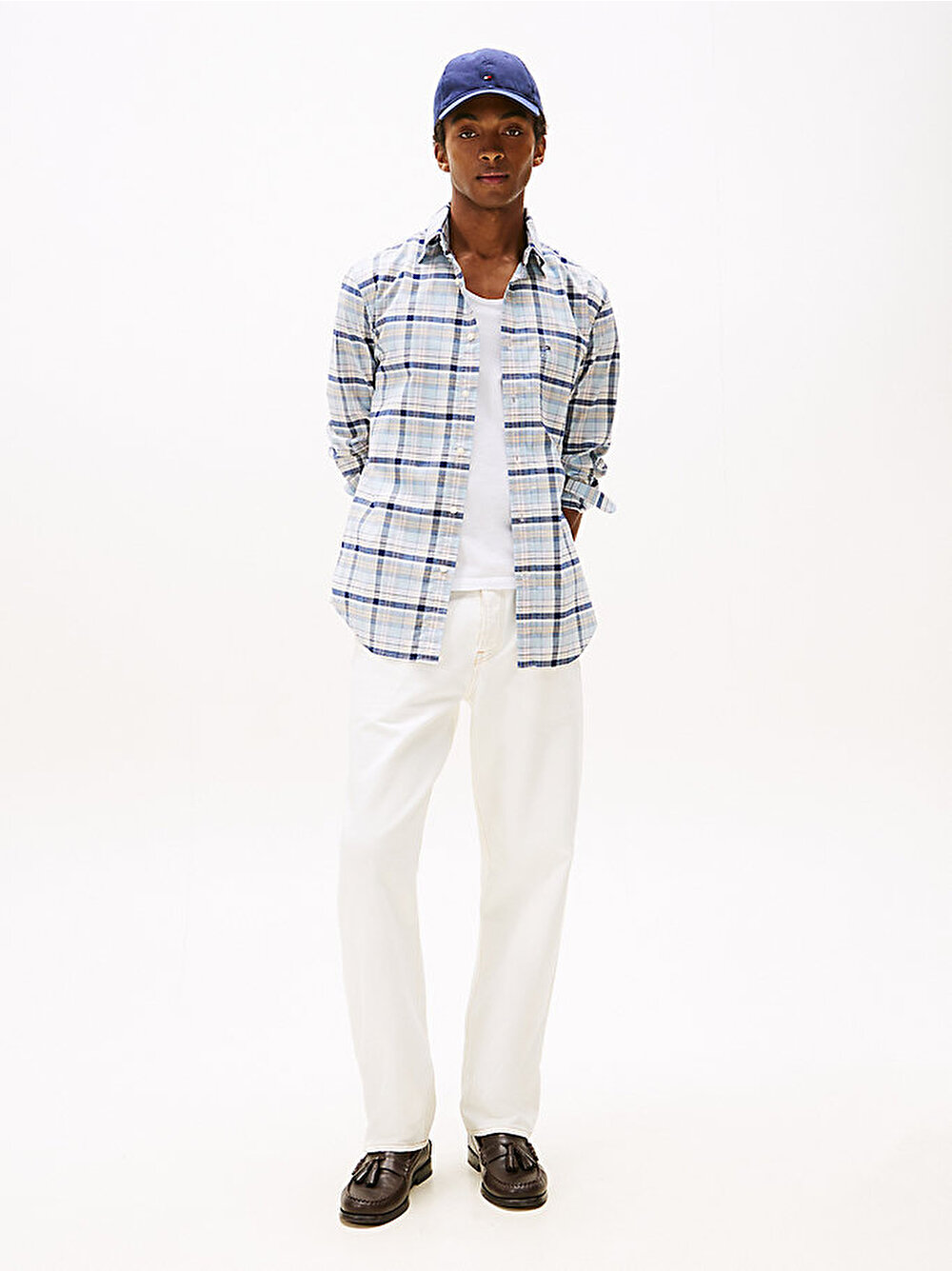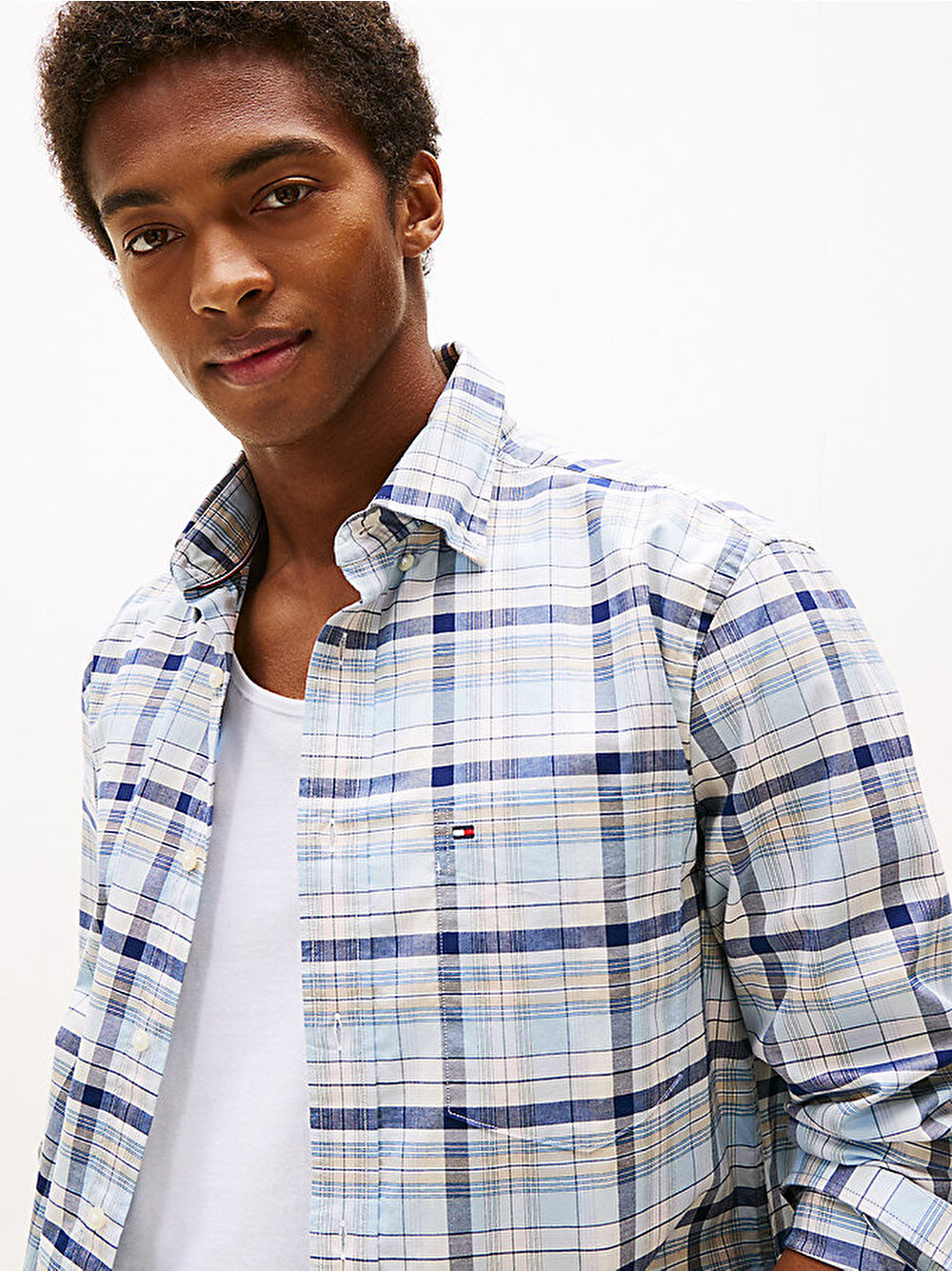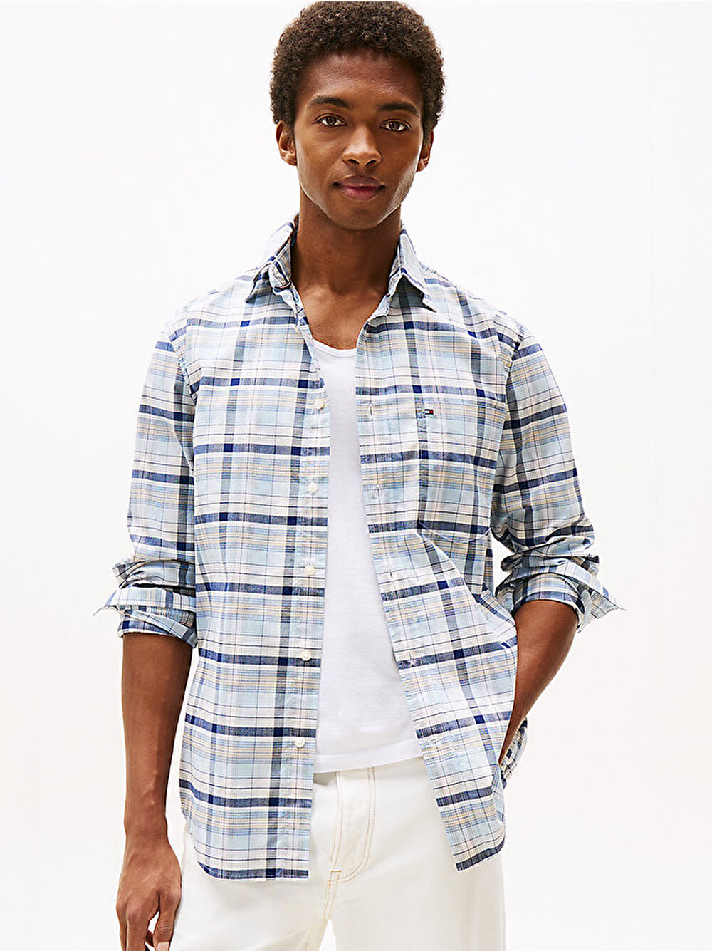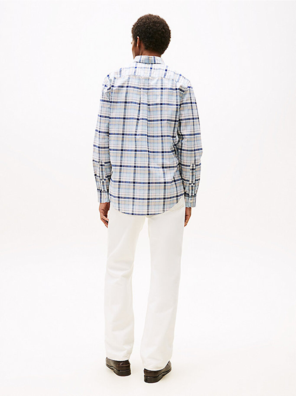 Canlı ekose deseni, düğmeli yakası ve göğüs cebi, bu zamansız Oxford gömleğe farklı bir dokunuş katıyor.