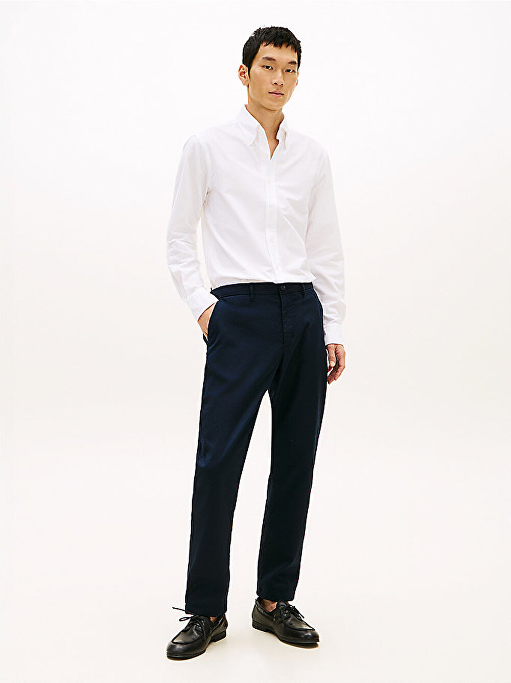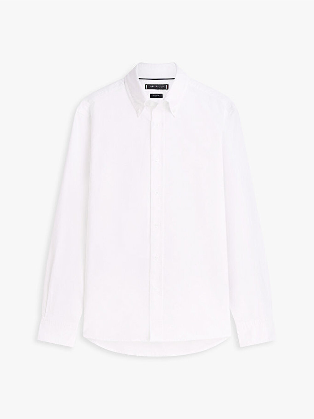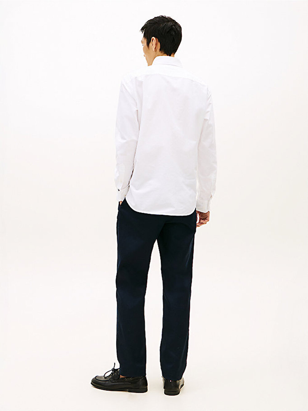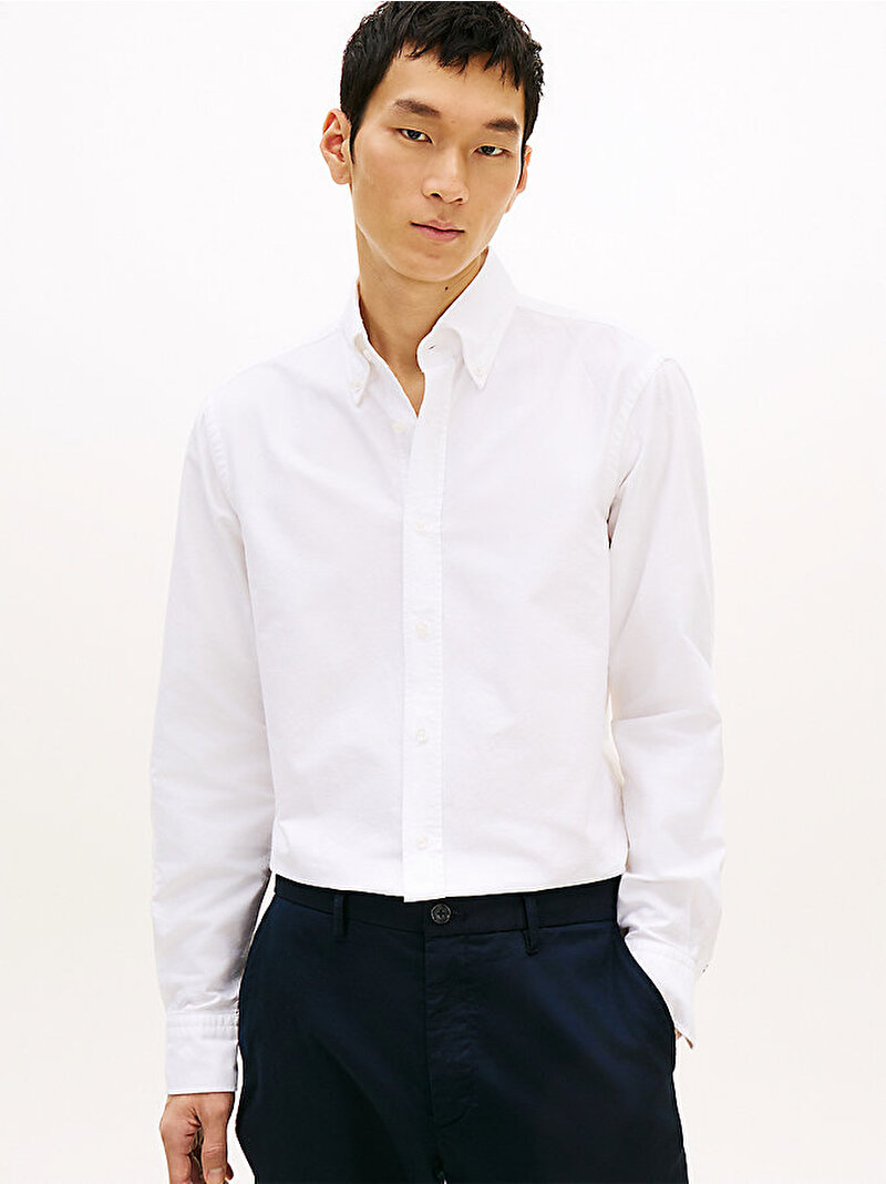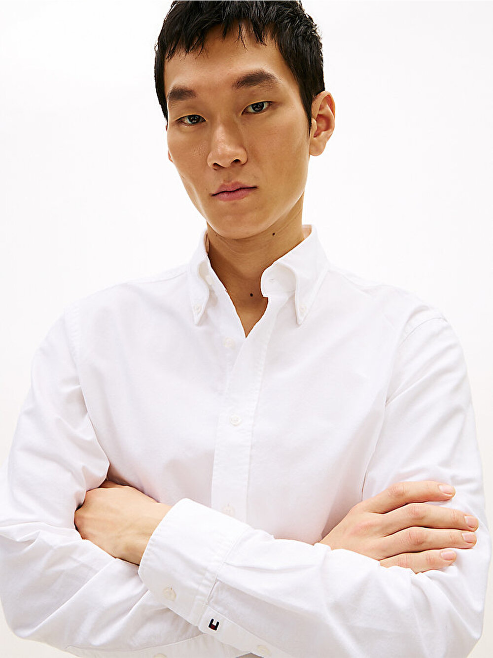 Bu Oxford gömlek, dikkat çekmeyen bayrak nakışıyla birlikte, köşeli manşetler ve düğmeli yakayla terzi işi net bir görünüm sunuyor.