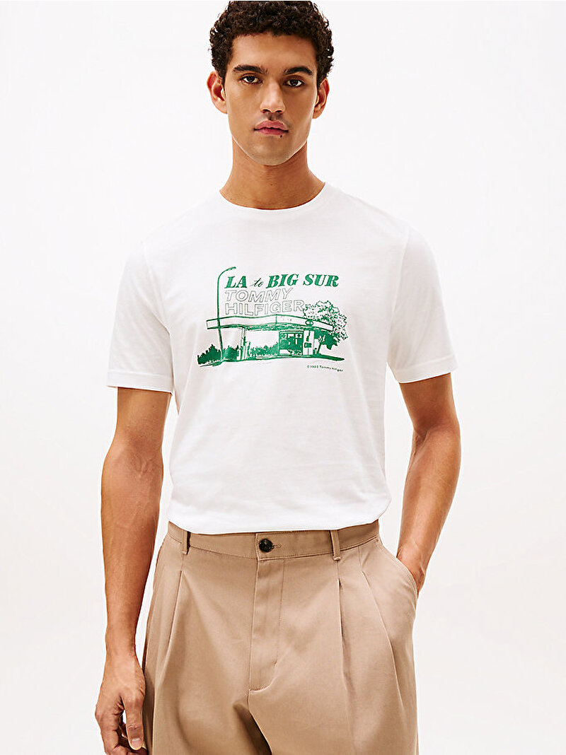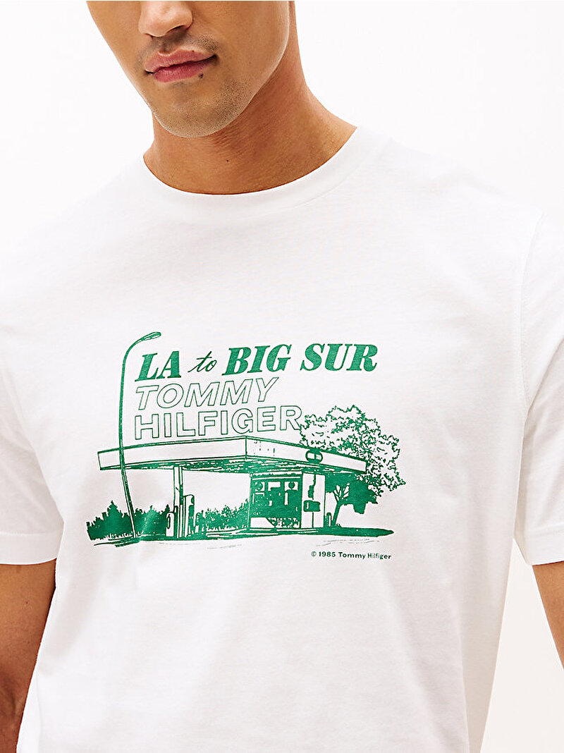 Amerikan servis istasyonunu gösteren etkileyici fotoğraf baskısıyla bu saf pamuklu jarse T-shirt ile retro yolculuk estetiğini kucaklayın.