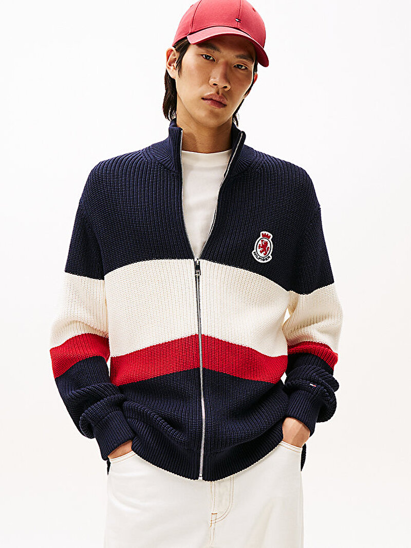 Renk bloklu tasarımı ve uyumlu TH arma aplikesiyle bu fermuarlı kazak, triko stilinize cesur ve sportif bir hava katar.