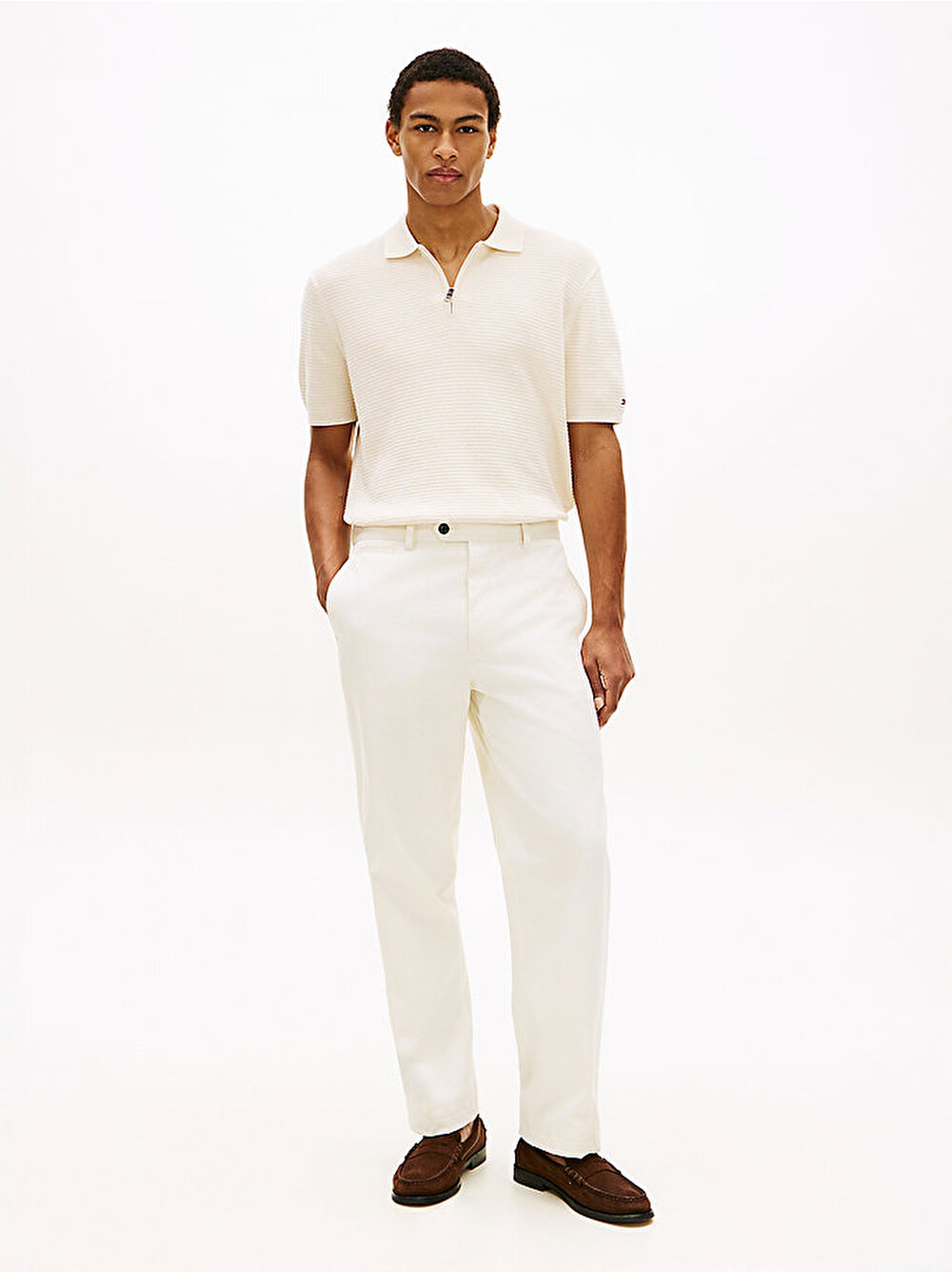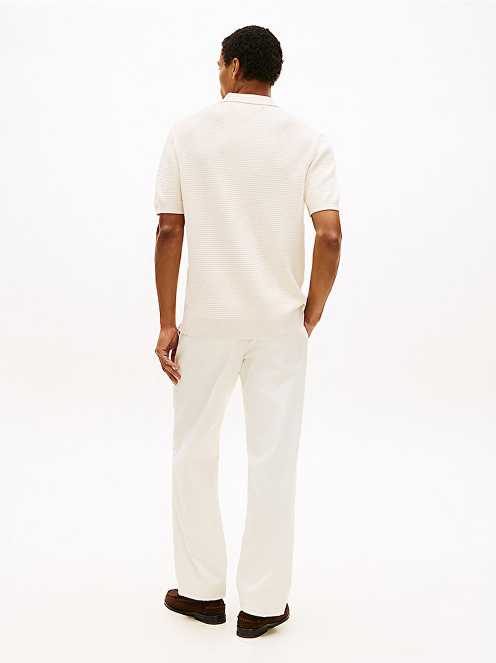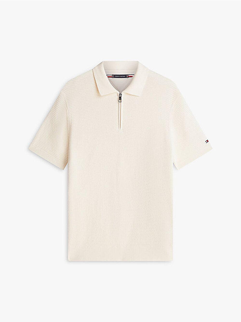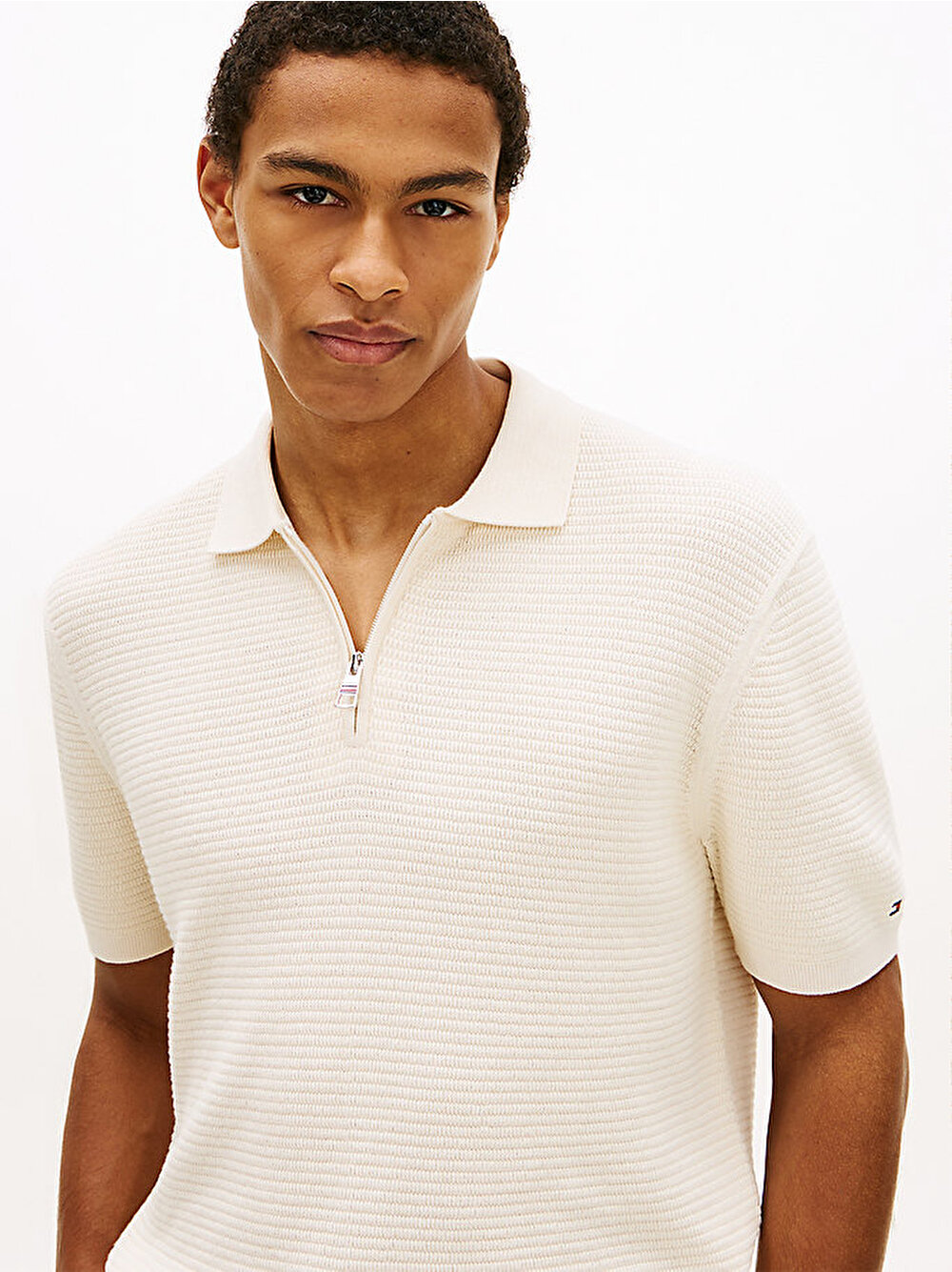 Sportif fermuarlı pat detayıyla öne çıkan bu polo tişört, daha dokulu ve dikkat çekici bir görünüm için saf pamuktan kalın örgü tasarımla üretilmiştir.