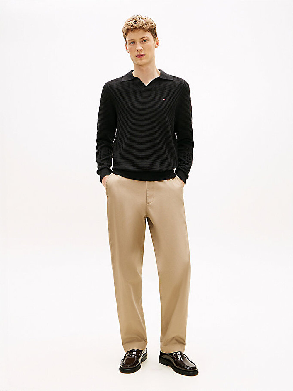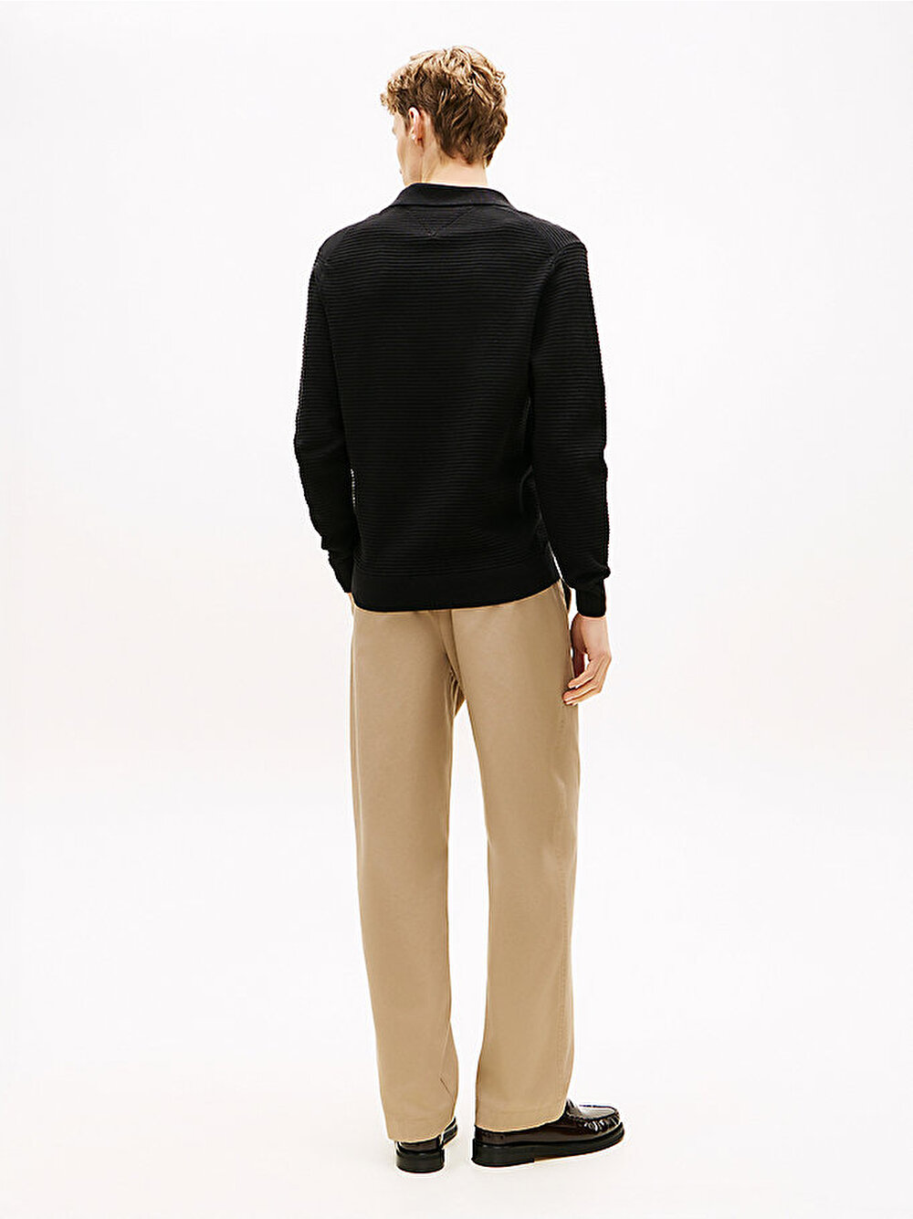 Saf pamuktan üretilen bu kazak, dokulu örgü yapısı ve şık polo yakasıyla rafine bir görünüm sunuyor.