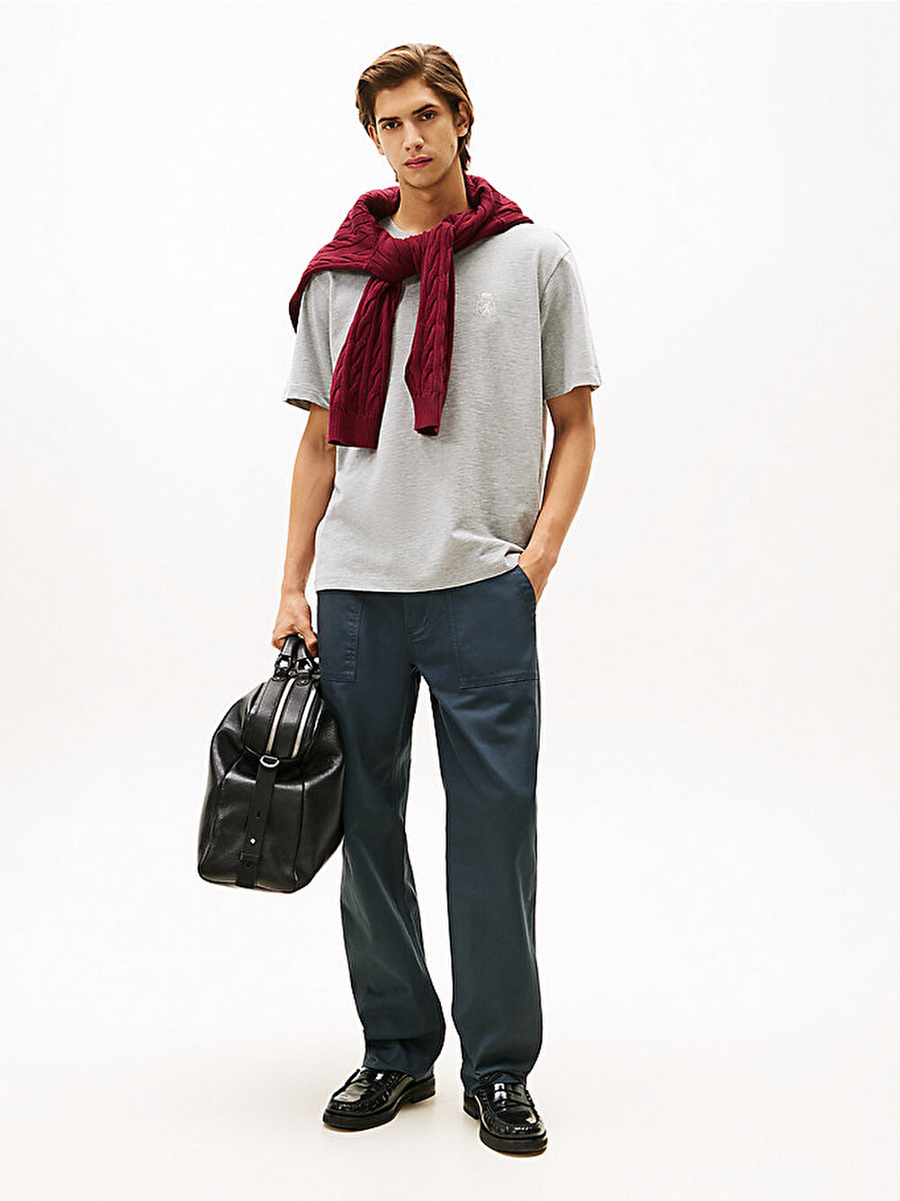 Bu jarse tişörtün göğsünde yer alan tonal TH armalı nakış, üniversite trendine ince bir selam gönderiyor.