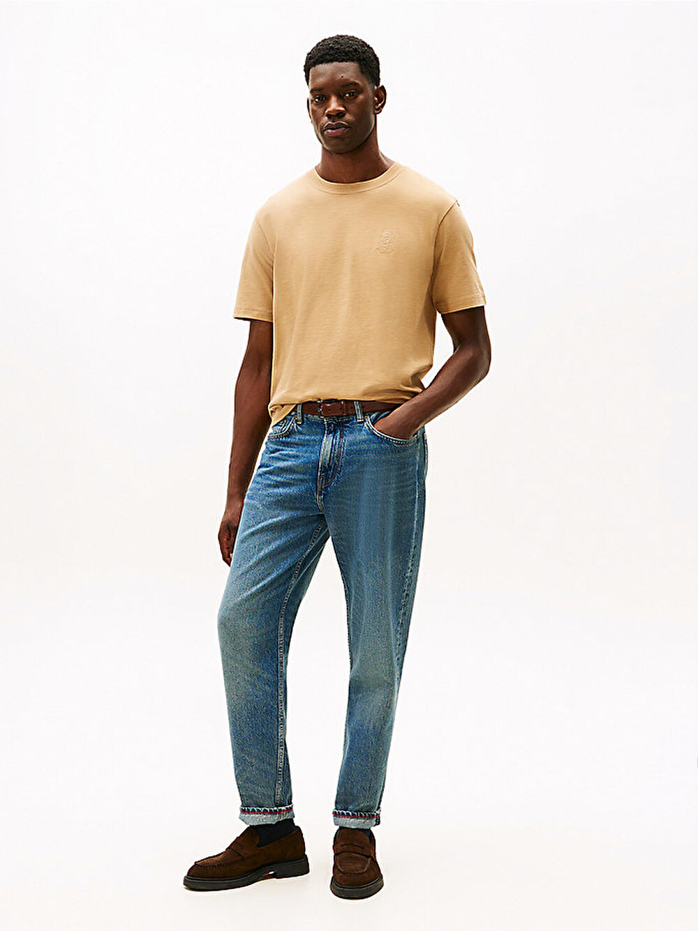Bu jarse tişörtün göğsünde yer alan tonal TH armalı nakış, üniversite trendine ince bir selam gönderiyor.