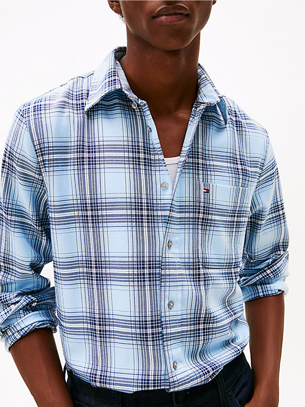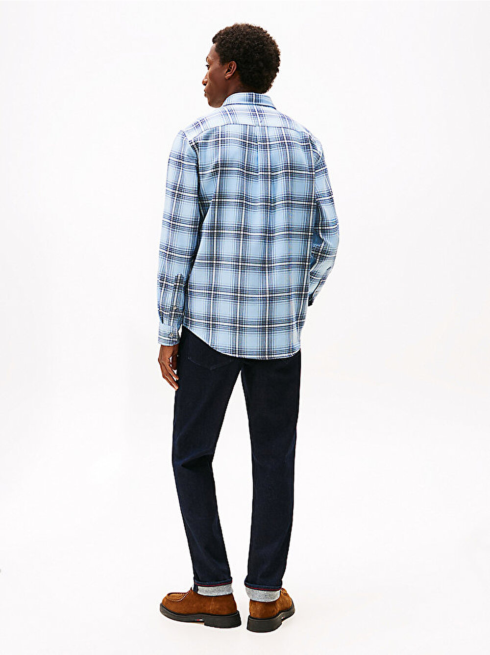 Tamamı kareli desen, bu dimi gömleğe hareket katarken, hafif esneklik ise katmanlı giyimi kolaylaştırıyor.